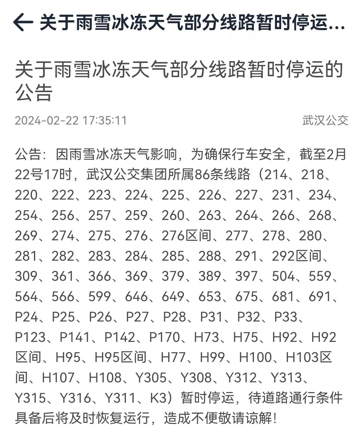 公告:因雨雪冰冻天气影响,为确保行车安全,截至2月22号17时,武汉公交集团所属86条线路(214、218、220、222、223、224、225、226、227、231、234、254、256、257、259、260、263、264、266、268、269、274、275、276、276区间、277、278、280、281、282、283、284、285、288、291、292区间、309、361、366、369、379、389、397、504、559、564、566、599、646、649、653、675、681、691、P24、P25、P26、P27、P28、P31、P32、P33、P123、P141、P142、P170、H73、H75、H92、H92区间、H95、H95区间、H77、H99、H100、H103区间、H107、H108、Y305、Y308、Y312、Y313、Y315、Y316、Y311、K3)暂时停运,待道路通行条件具备后将及时恢复运行,造成不便敬请谅解!