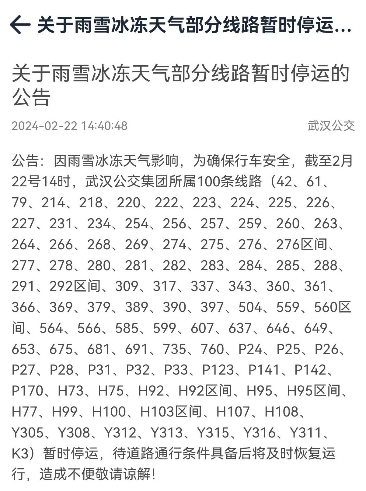 公告:因雨雪冰冻天气影响,为确保行车安全,截至2月22号14时,武汉公交集团所属100条线路(42、61、79、214、218、220、222、223、224、225、226、227、231、234、254、256、257、259、260、263、264、266、268、269、274、275、276、276区间、277、278、280、281、282、283、284、285、288、291、292区间、309、317、337、343、360、361、366、369、379、389、390、397、504、559、560区间、564、566、585、599、607、637、646、649、653、675、681、691、735、760、P24、P25、P26、P27、P28、P31、P32、P33、P123、P141、P142、P170、H73、H75、H92、H92区间、H95、H95区间、H77、H99、H100、H103区间、H107、H108、Y305、Y308、Y312、Y313、Y315、Y316、Y311、K3)暂时停运,待道路通行条件具备后将及时恢复运行,造成不便敬请谅解!
