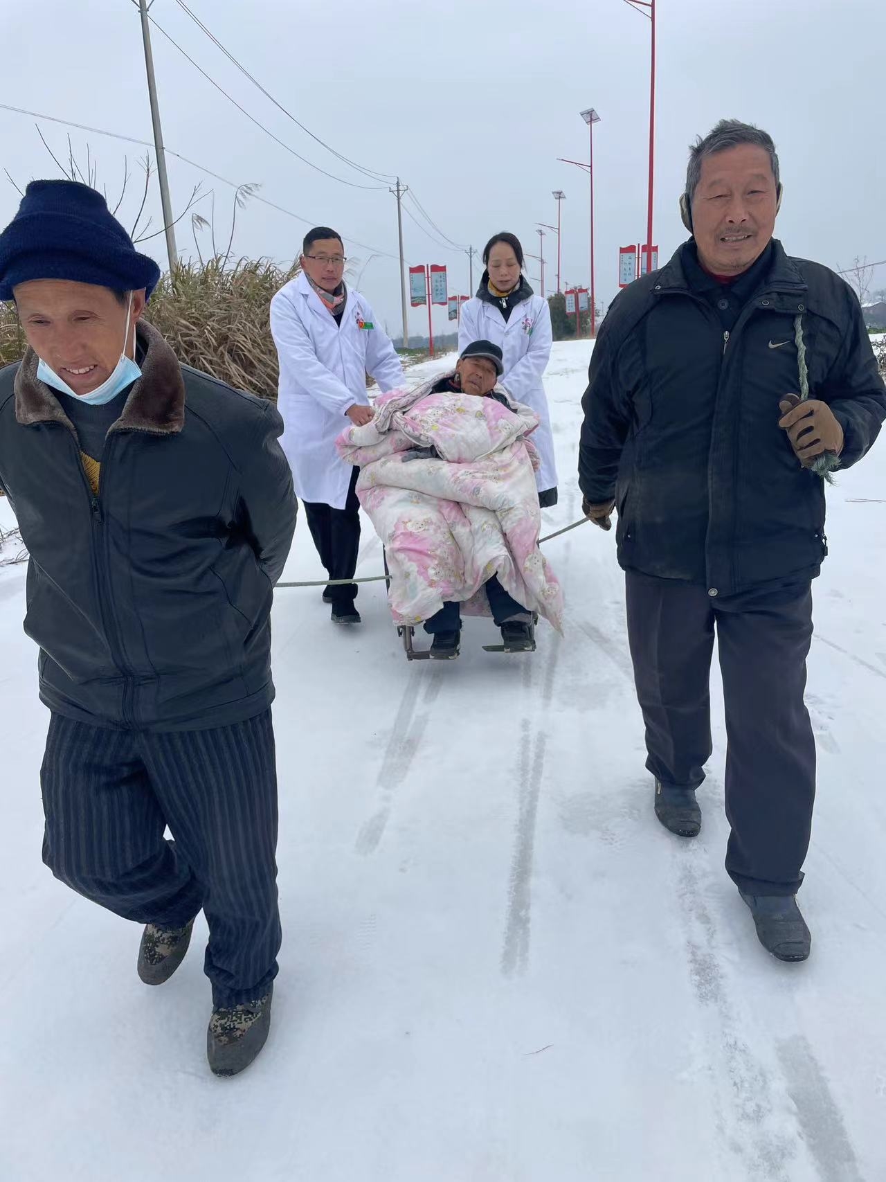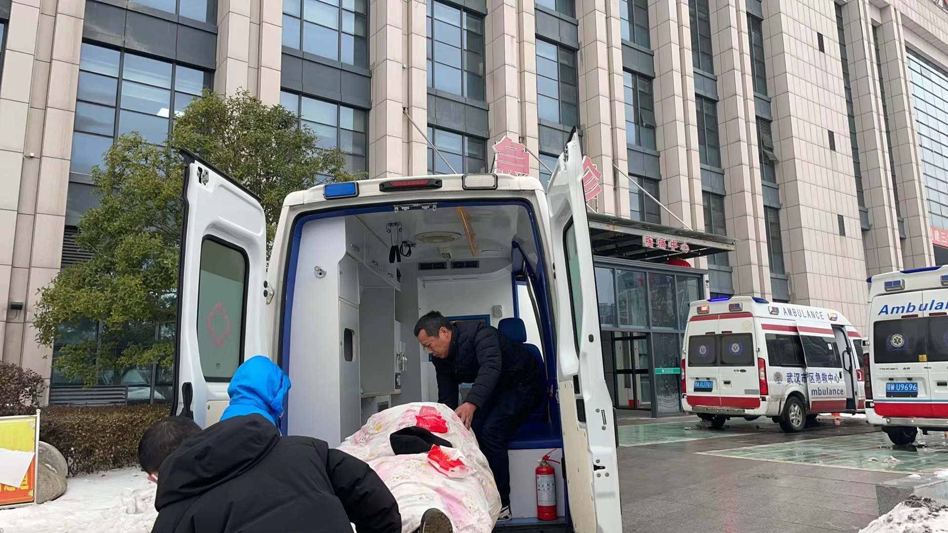 雪地上,易同洲和柯芳,一个人推着轮椅,一个人扶着轮椅上的病人,两个村民用两根绳子在前面拉着轮椅。风雪之中,轮椅能走就推,轮椅不能走就抬,祝庙村到梁湖路2公里的路程,迎着刺骨的风、雪,小心翼翼走了1个多小时。 在医生和村民的共同努力下,终于把项爷爷送到救护车停靠的位置,并齐心协力把老人抬上救护车。随后,救护车蓝色警灯亮起,警笛长鸣,一路驶向江夏区第一人民医院急诊科。