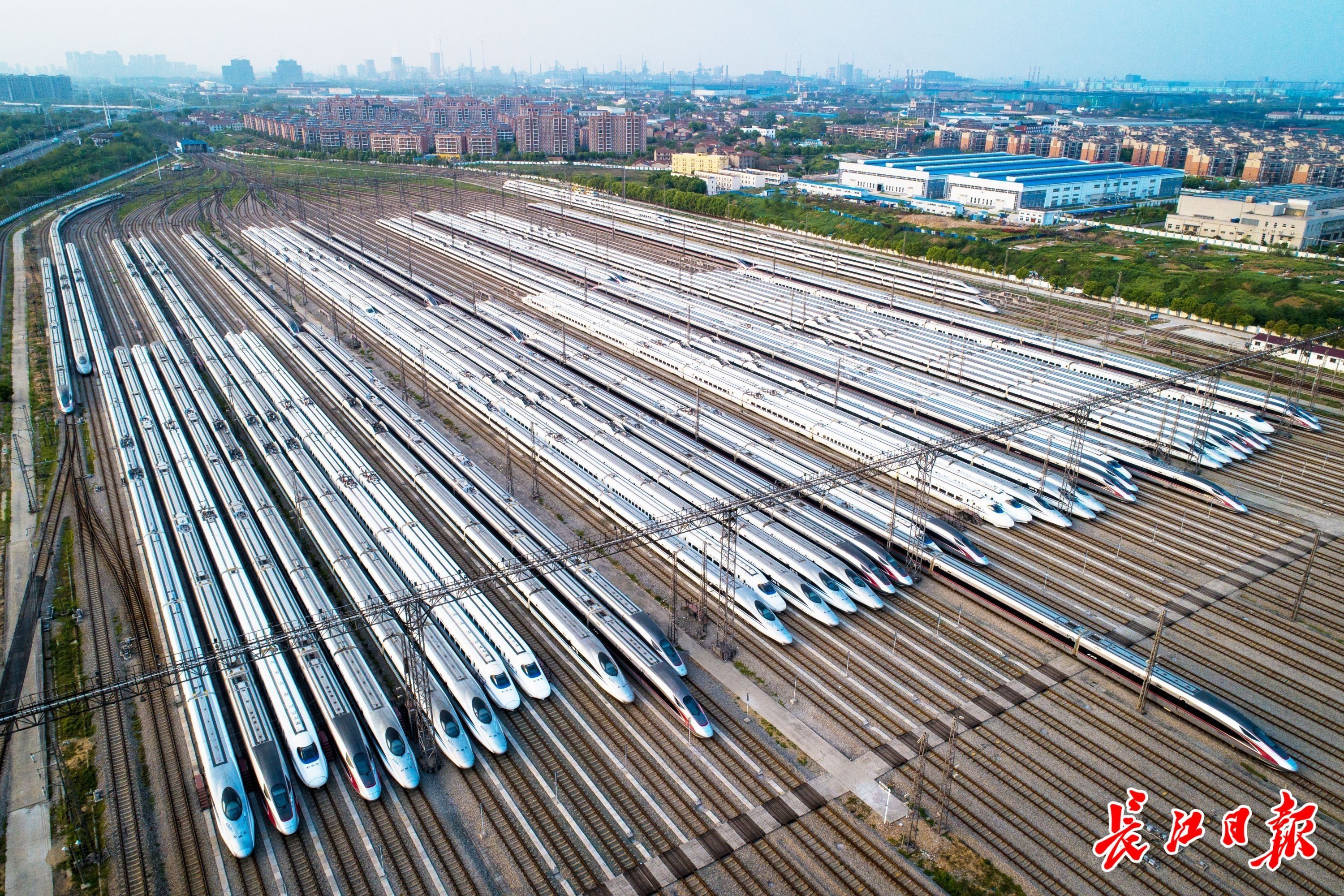 2020年4月7日,武汉动车段近百组动车整齐停放蓄势待发。长江日报记者任勇 摄