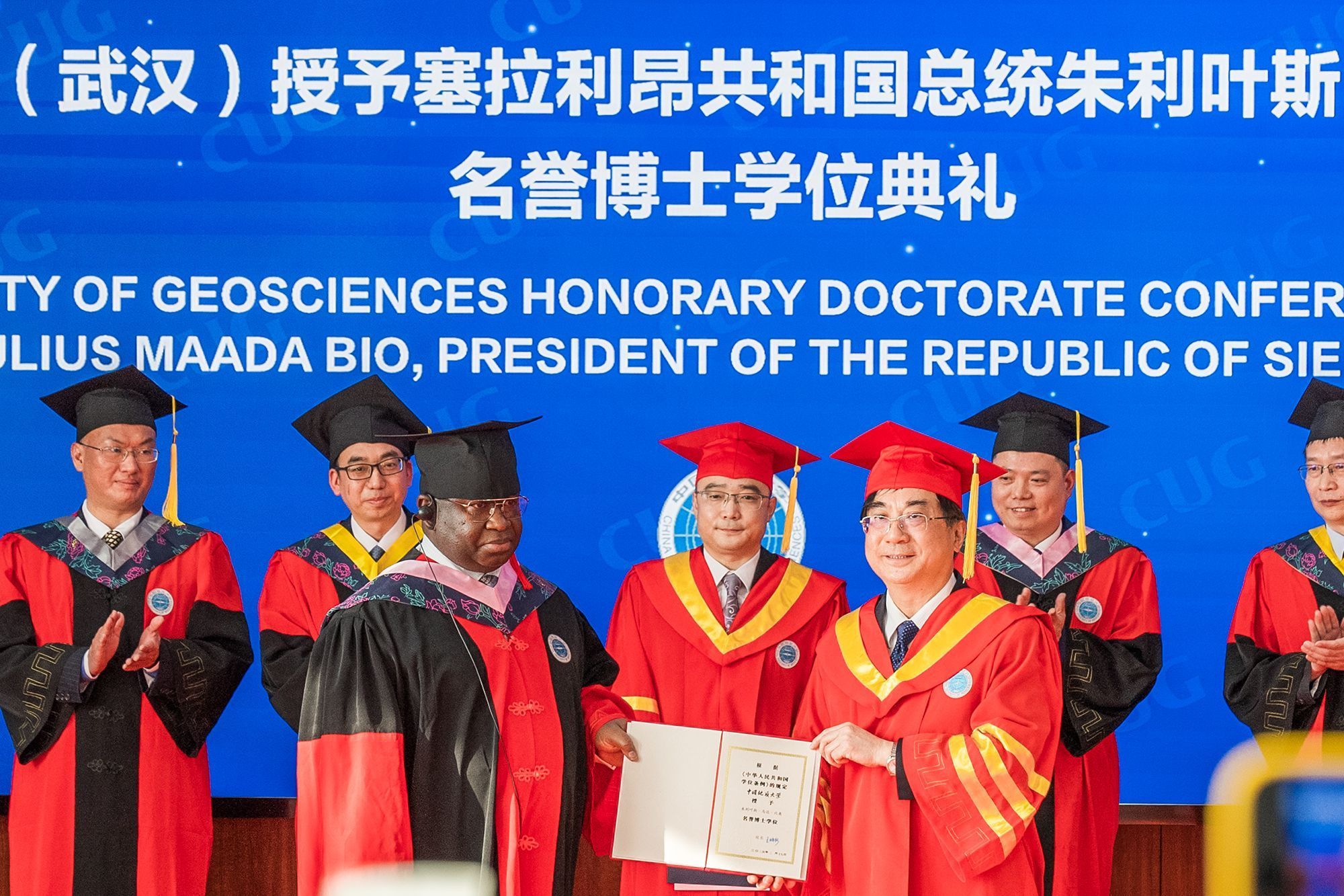 中国地质大学(武汉)校长王焰新为比奥总统颁发名誉博士学位证书并拨穗,副校长王力哲宣读了国务院学位委员会《关于同意授予朱利叶斯·马达·比奥名誉博士学位的决定》。