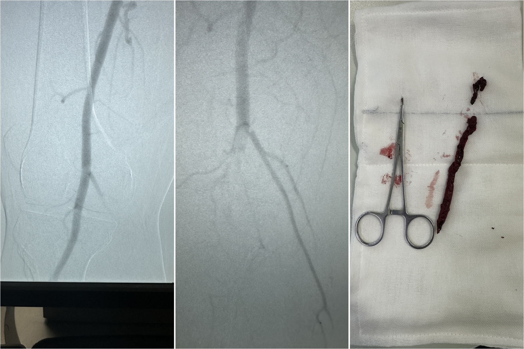 “再多做一些努力。”吴龙教授协调将廖先生进入DSA手术室,并请血管外科李沁教授会诊……术中,从廖先生右腿腘动脉,取出一长约8cm的血栓,右脚皮肤温度立即转暖,足背动脉搏动触及,顺利保住右下肢。