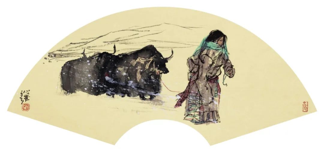 中囯美术家协会会员、江汉大学艺术学院院长王心耀此次的参展作品是纸本扇面《藏女图》。他告诉长江日报记者,作品中的藏女在旷野上牵着牦牛,是为了反映藏地特有的风情,高原上的苍茫、空旷、神秘,都展示在藏女历经风雪的脸上,环境的艰苦衬托出藏女的艰辛、坚毅,让观众感受到她们是高原上伟大的女性。