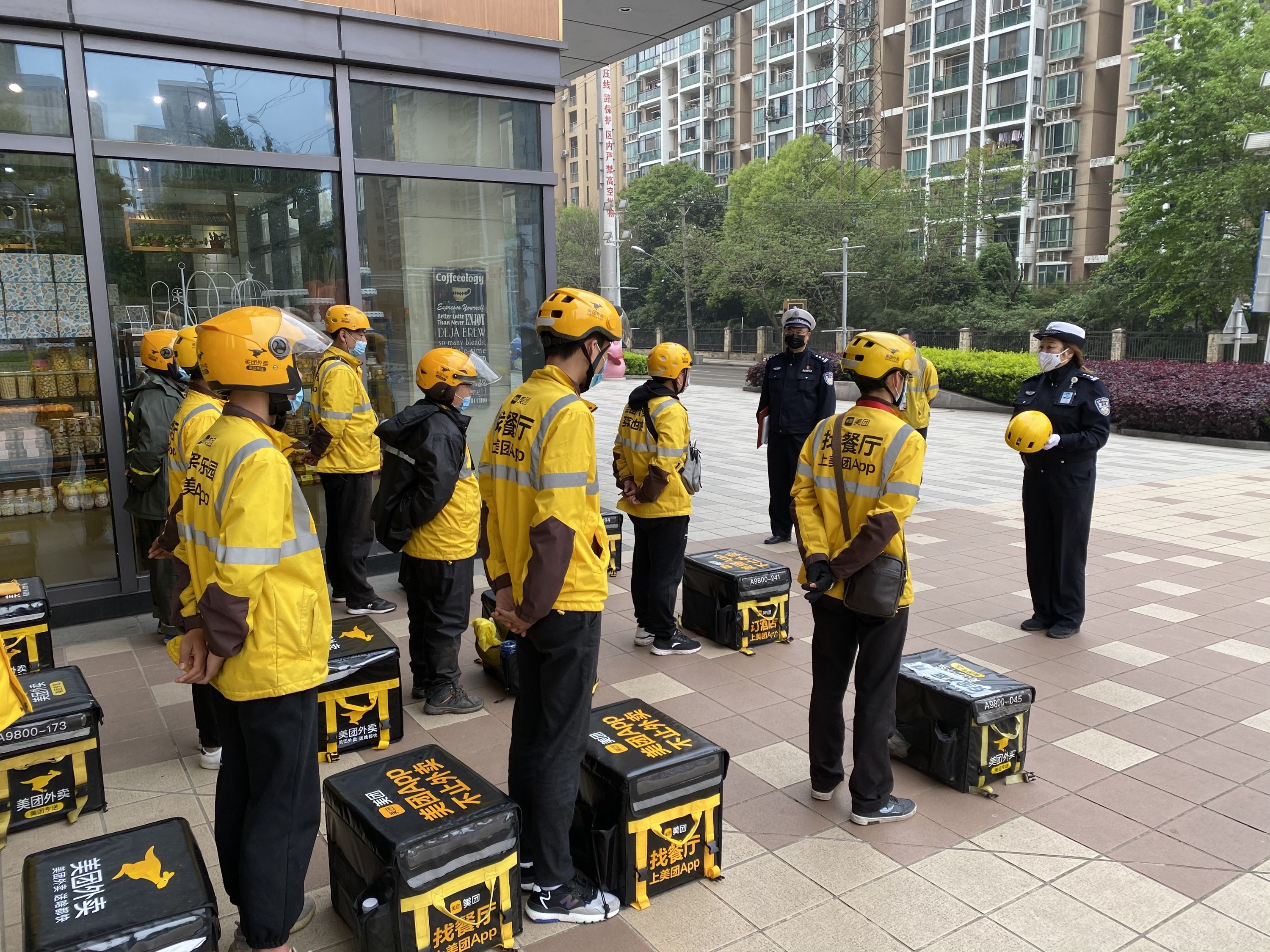 外卖员上班前先接受交通安全、交通法规培训。通讯员董冠男摄