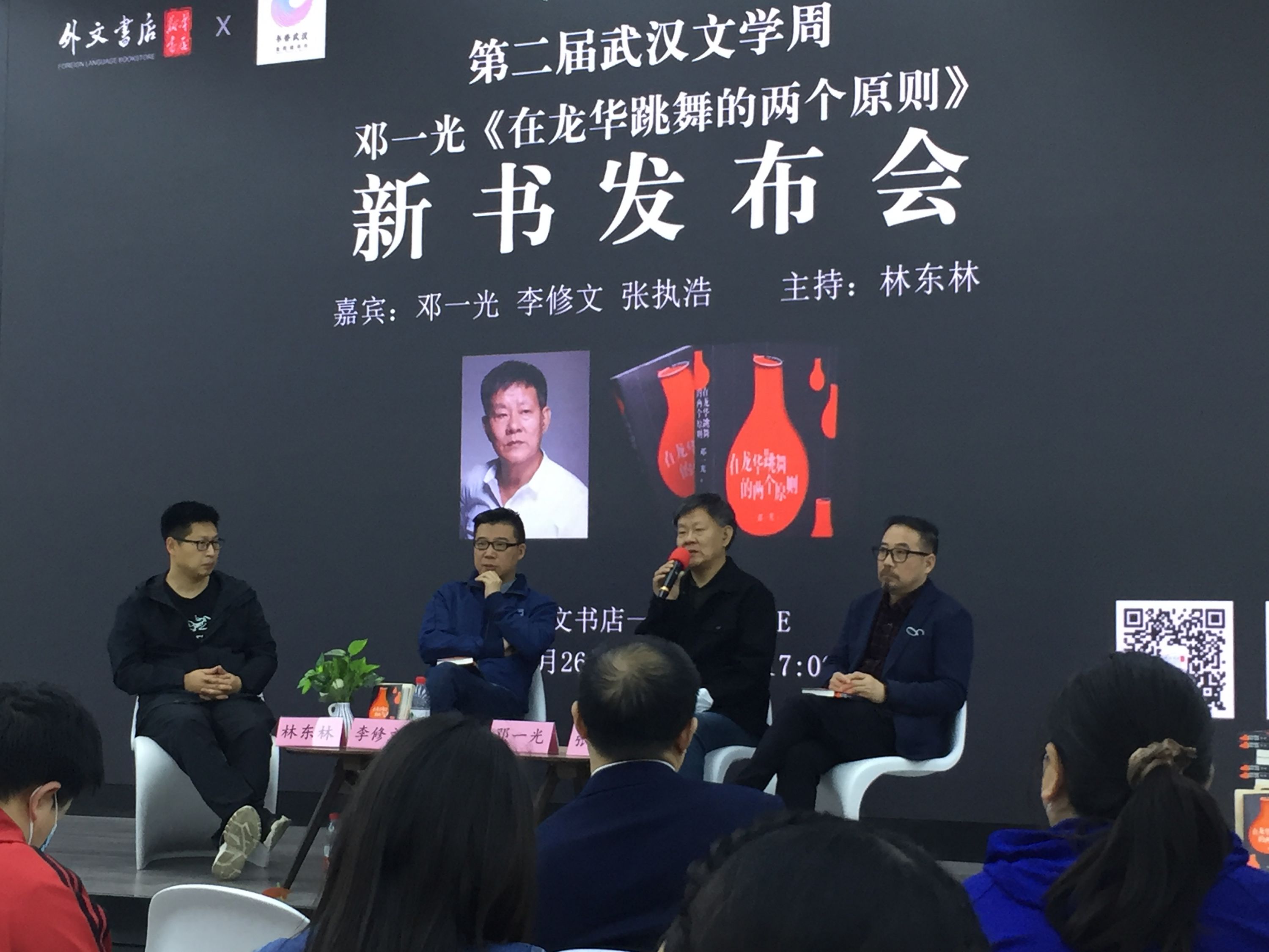 长江日报4月26日讯 4月26日下午,第二届武汉文学周活动之一的“邓一光《在龙华跳舞的两个原则》新书发布会”在武昌中南路外文书店举行,作家邓一光与省作协主席李修文、省作协副主席张执浩、作家林东林,以及前来参加发布会的武汉文学爱好者分享创作心得,回望在武汉、深圳双城的数十年生活与写作历程。