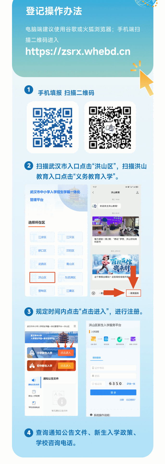 符合入学条件的适龄儿童,统一使用《武汉市中小学入学招生学籍一体化管理平台》(以下简称“入学招生平台”)进行新生招生登记,登记时间:2024年3月10日0时至2024年3月20日24时。非登记时间段本平台将不开放注册登记功能。入学招生平台网址为:https://zsrx.whebd.cn。电脑端建议使用谷歌或火狐浏览器;手机端扫描二维码进入。