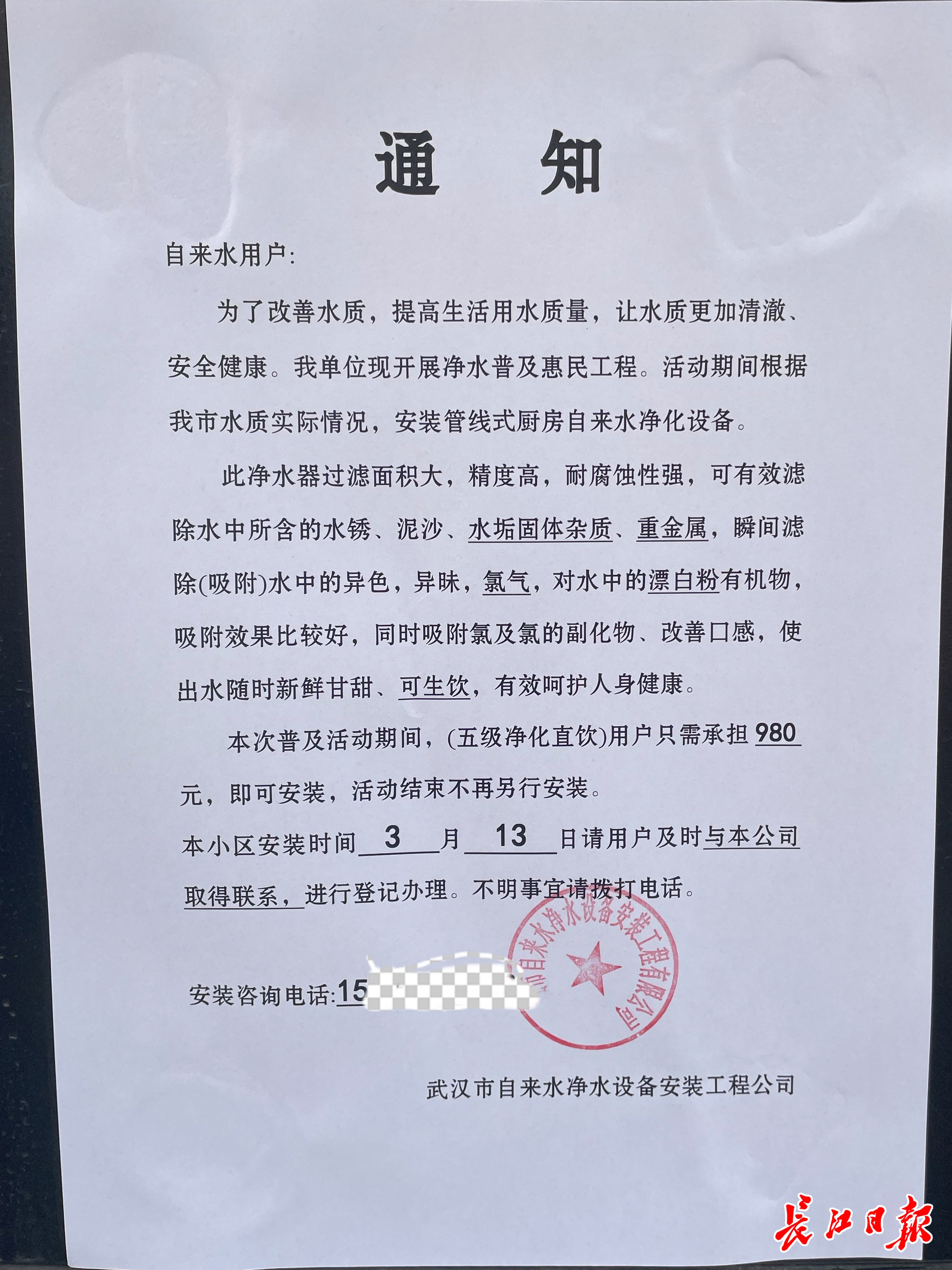 “为改善水质,提高生活用水,我单位现开展普及惠民工程。活动期间根据我市水质实际情况,安装管线式厨房自来水净化设备……本次普及活动期间,用户只需承担980元即可安装,活动结束不再另行安装。”3月10日,家住武汉市东西湖区开屏里社区的张女士有点疑惑,家门口这则通知,不知道是否靠谱?