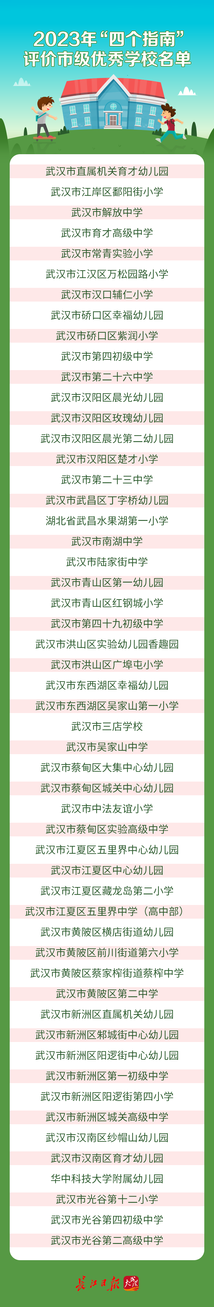 长江日报大武汉客户端3月12日讯(记者刘嘉)3月12日,武汉市教育局公布2023年“四个指南”评价市级优秀学校,53所学校(幼儿园)榜上有名。