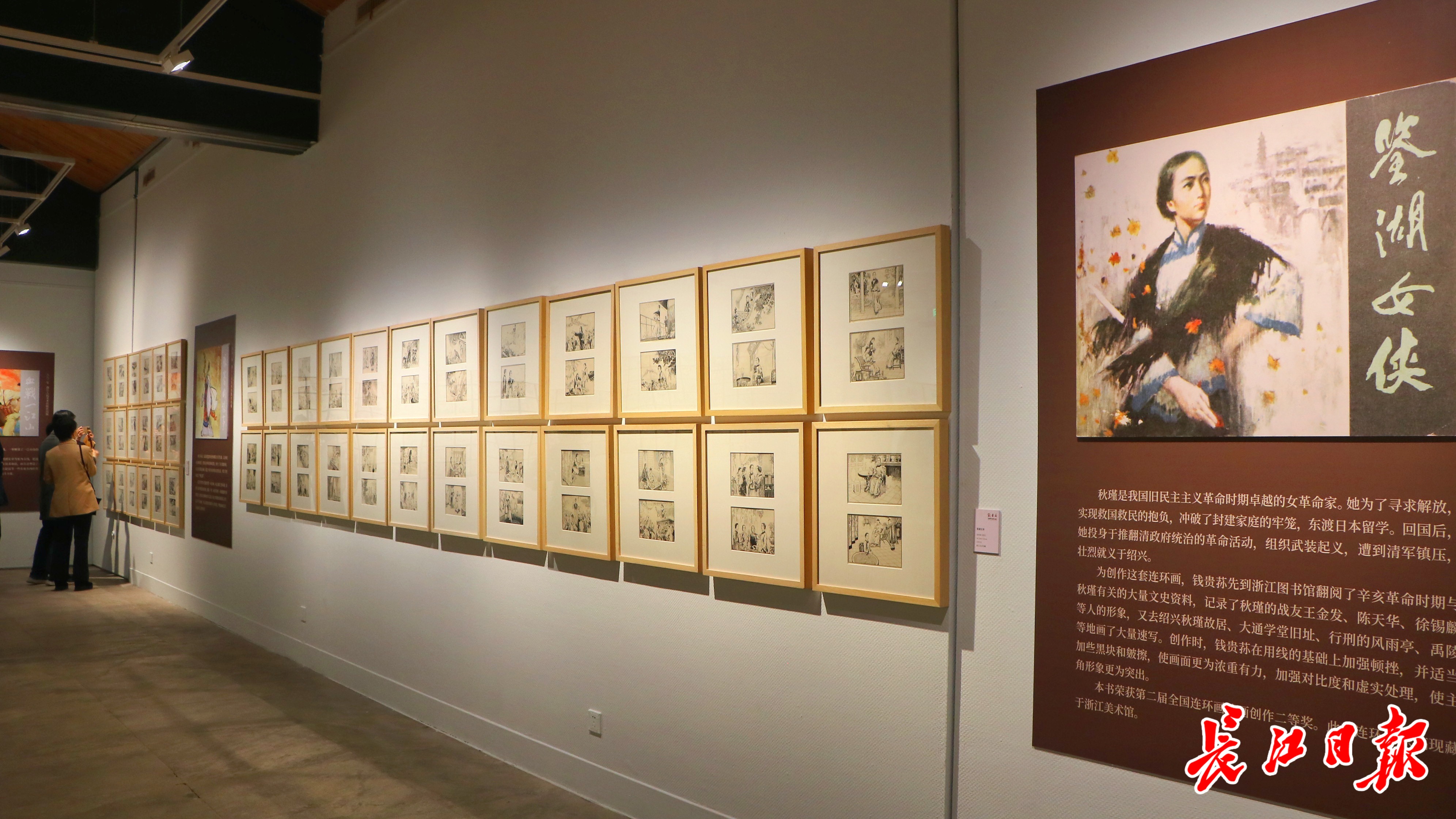 大量的连环画原稿展示是此次展览的亮点之一。作为中国传统的艺术形式,连环画的题材丰富多样,人的悲欢离合,事的曲折是非,构成了一个个生动变化的情节。记者看到,展出的一张张连环画如同电影分镜头,呈现着故事中的场景。在连环画《鉴湖女侠》中,一代巾帼英雄秋瑾坚毅英勇的形象跃然纸上,仔细看,门窗、橱、桌、小桥、圆拱门上都被刻上了那个年代的图案,人物神态、服饰、所处环境随着情节改变。钱贵荪在用线的基础上加强顿挫,并适当加些黑块和皴擦,使画面更为浓重有力,加强对比度和虚实处理,使主角形象更为突出。该书荣获第二届全国连环画绘画创作二等奖。