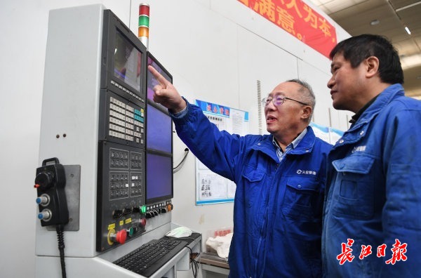 张海鸥(左)在3D打印数控机床操作台前指导技术人员。