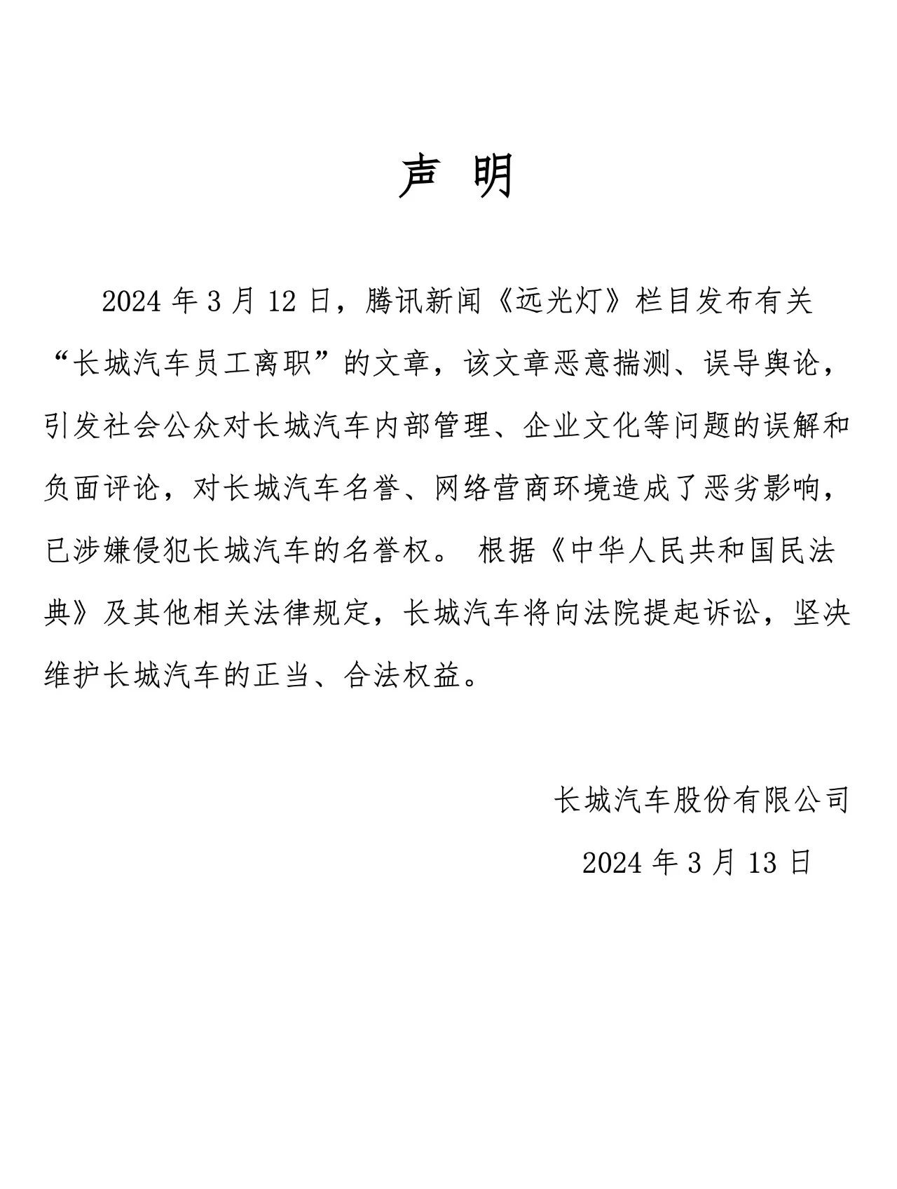 长城汽车深夜回应“员工离职”文章:恶意揣测,将向法院提起诉讼