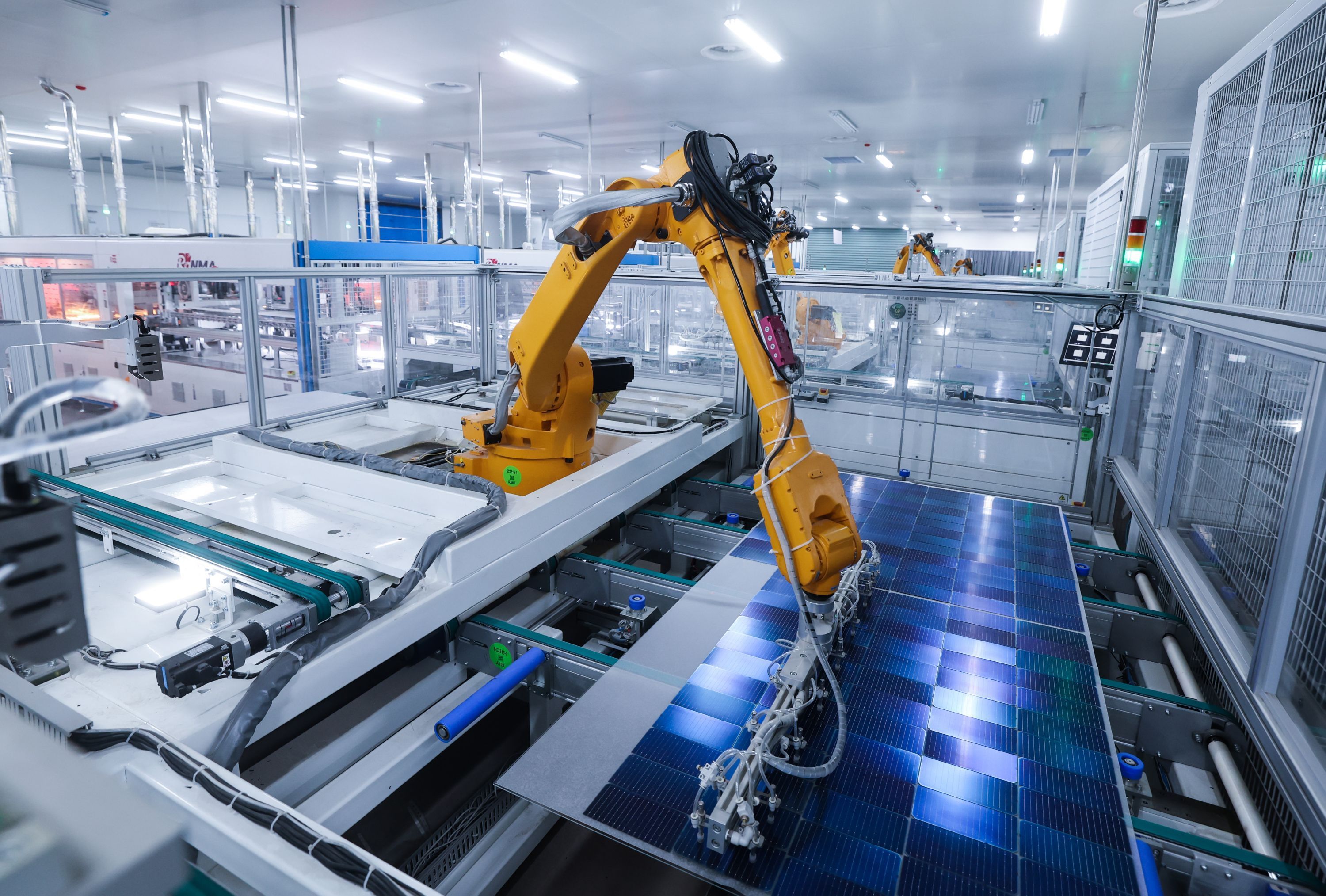 2024年1月4日,在浙江省金华市金义新区的润马光能科技(金华)有限公司,智能化车间的自动化生产线机械臂在生产晶硅太阳能电池片。