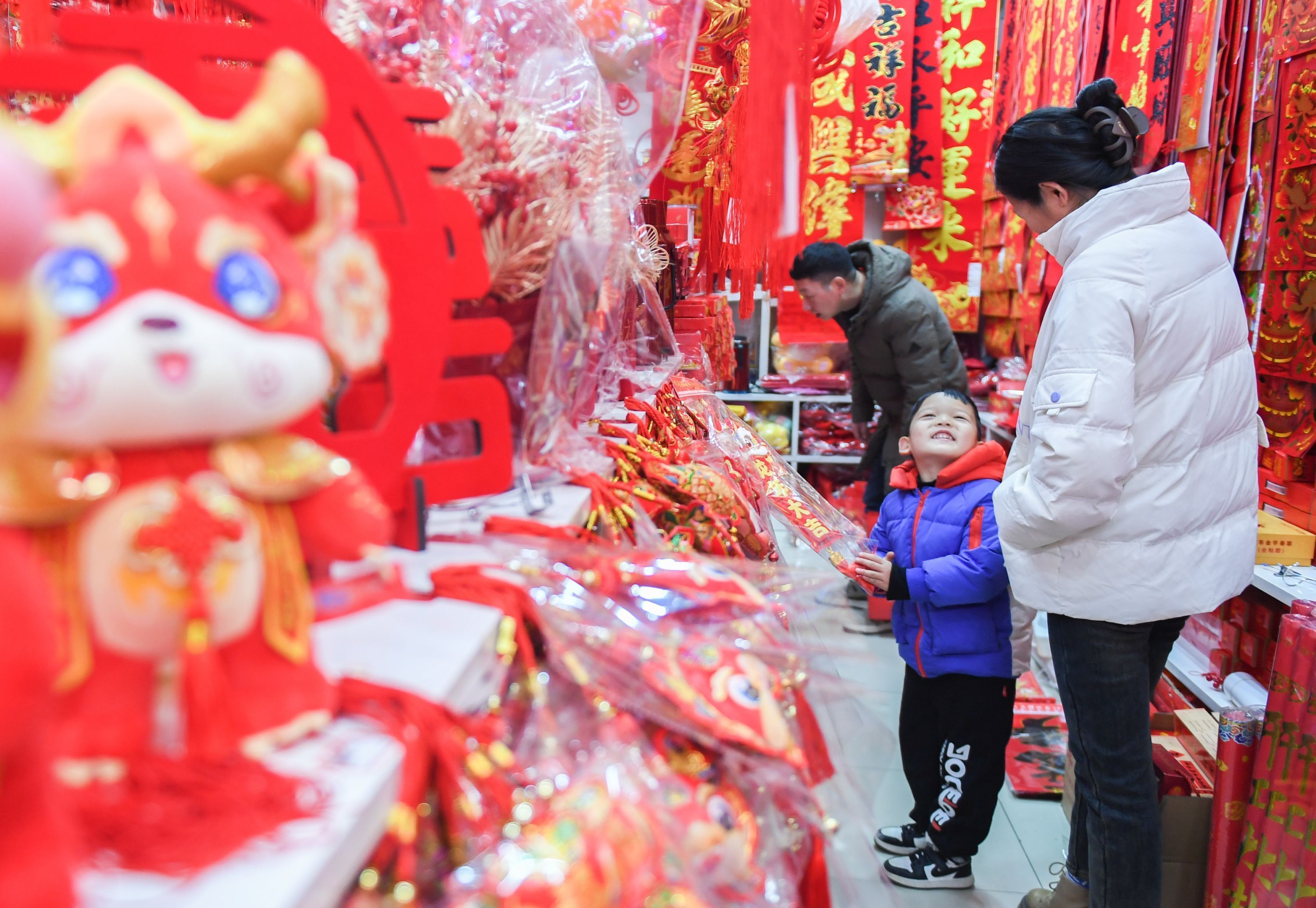 1月28日,市民在湖北省武汉市汉口北国际贸易城挑选春节饰品。新华社记者杜子璇 摄