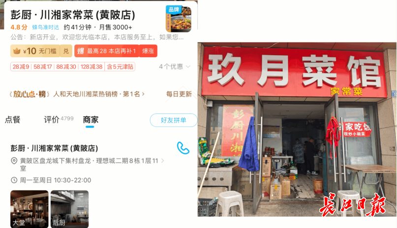 “彭厨”是一家全国连锁的湘菜店,总部在长沙,武汉有数十家加盟店。陈女士曾到彭厨堂食过,觉得味道不错。下单点外卖前,她特意查看了商家相册,看到餐厅布置跟记忆中的“彭厨”差不多,才放心下单。