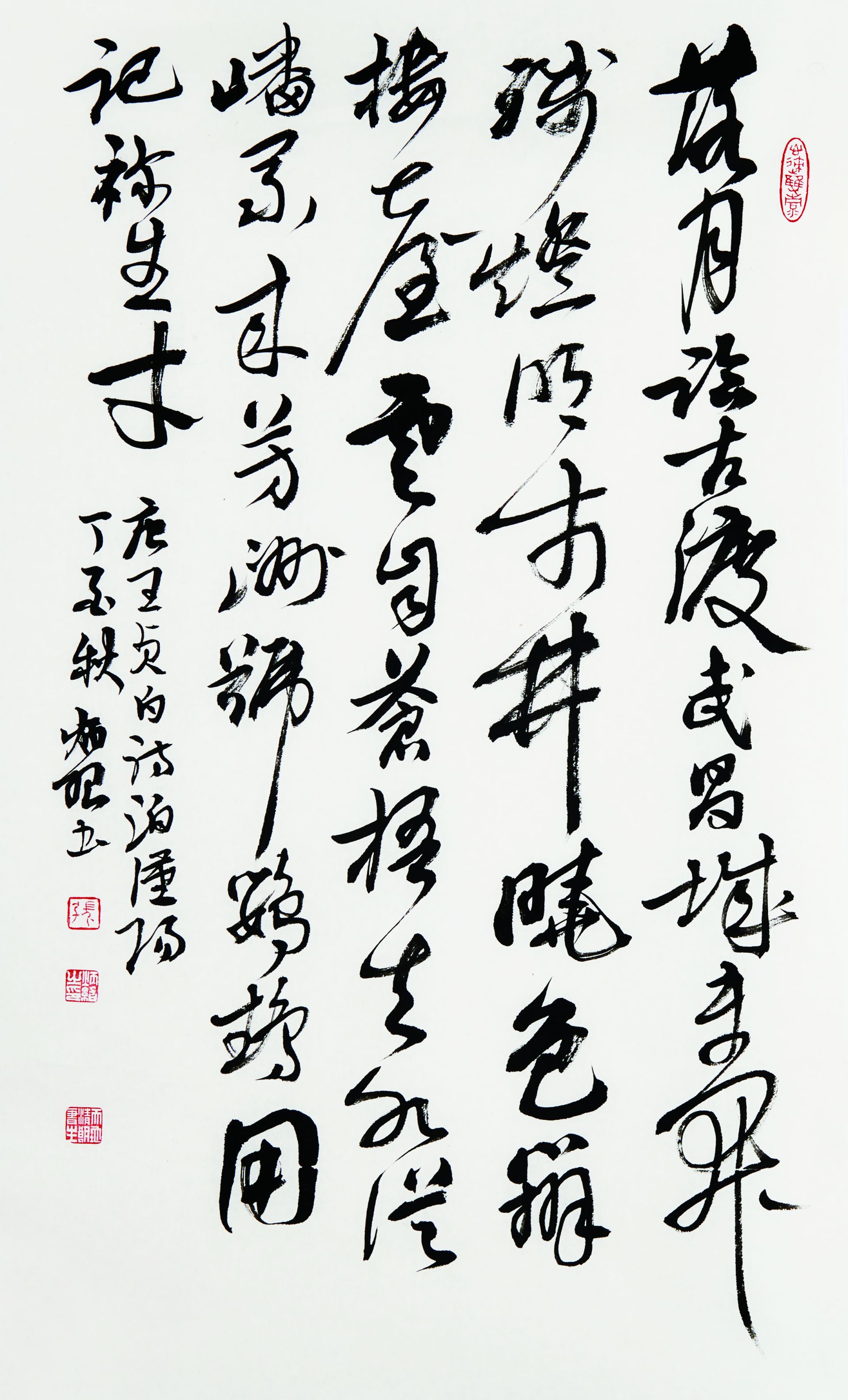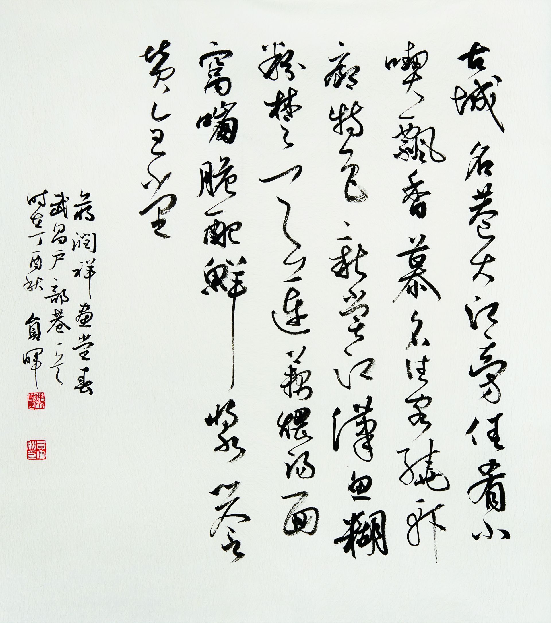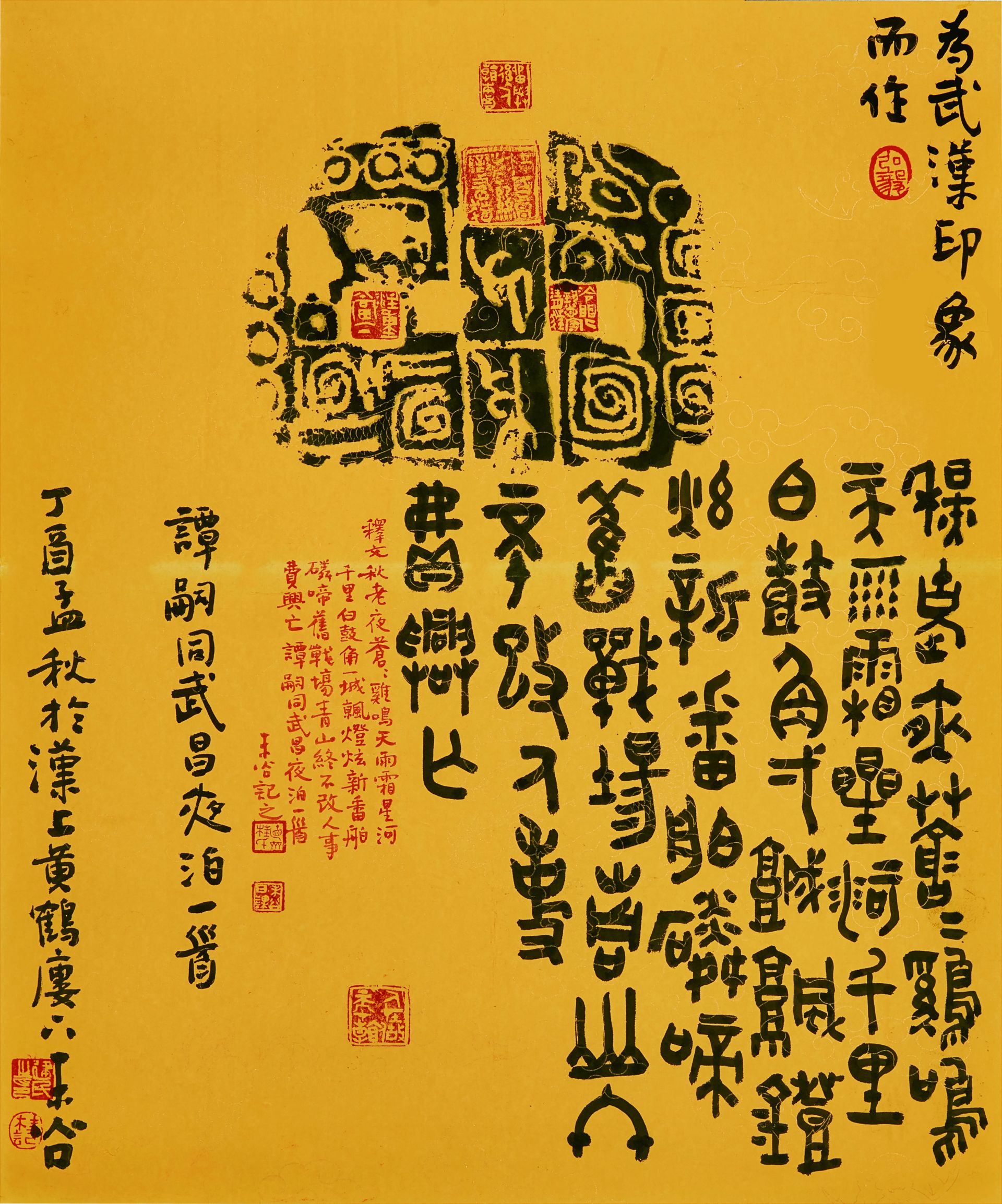 民以食为天,此诗以荆楚小吃为主线,展开了一幅美好武汉的画卷,为了更好地展现食、色、声、香,作者用“云头艳”浓墨,在开篇“古城”二字上施以重墨,突出强调了武汉的历史地位,利用行草表示手法在“鱼鲜糊粉”“楚天莲藕煨汤”“面窝嘣脆”的节奏和墨色浓淡上尽力表现。特别是最后一句,以草法为主,让人有一饮而尽,畅快淋漓之感,也进一步突出了武汉人的个性,同时彰显了武汉这个历史名城的飞速发展。