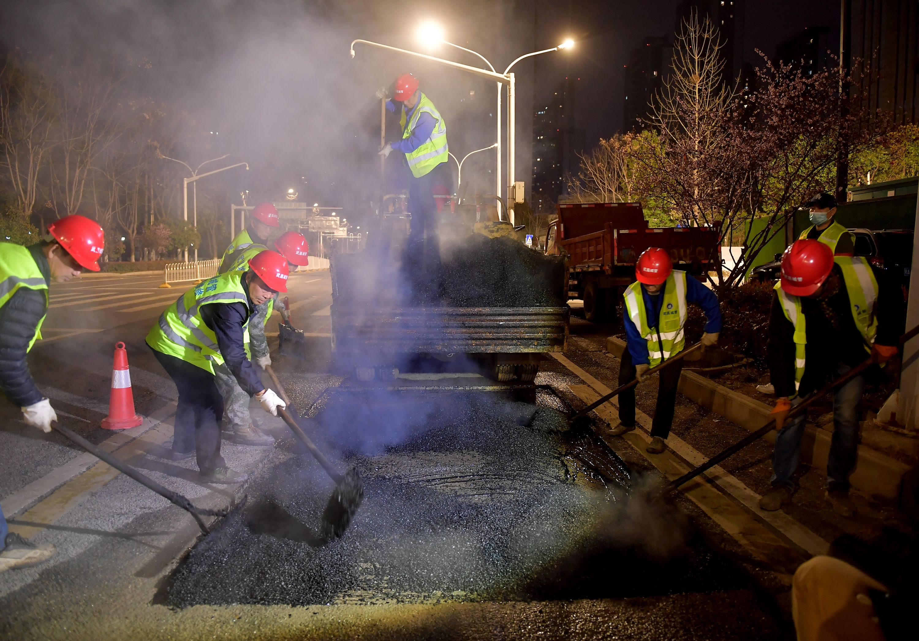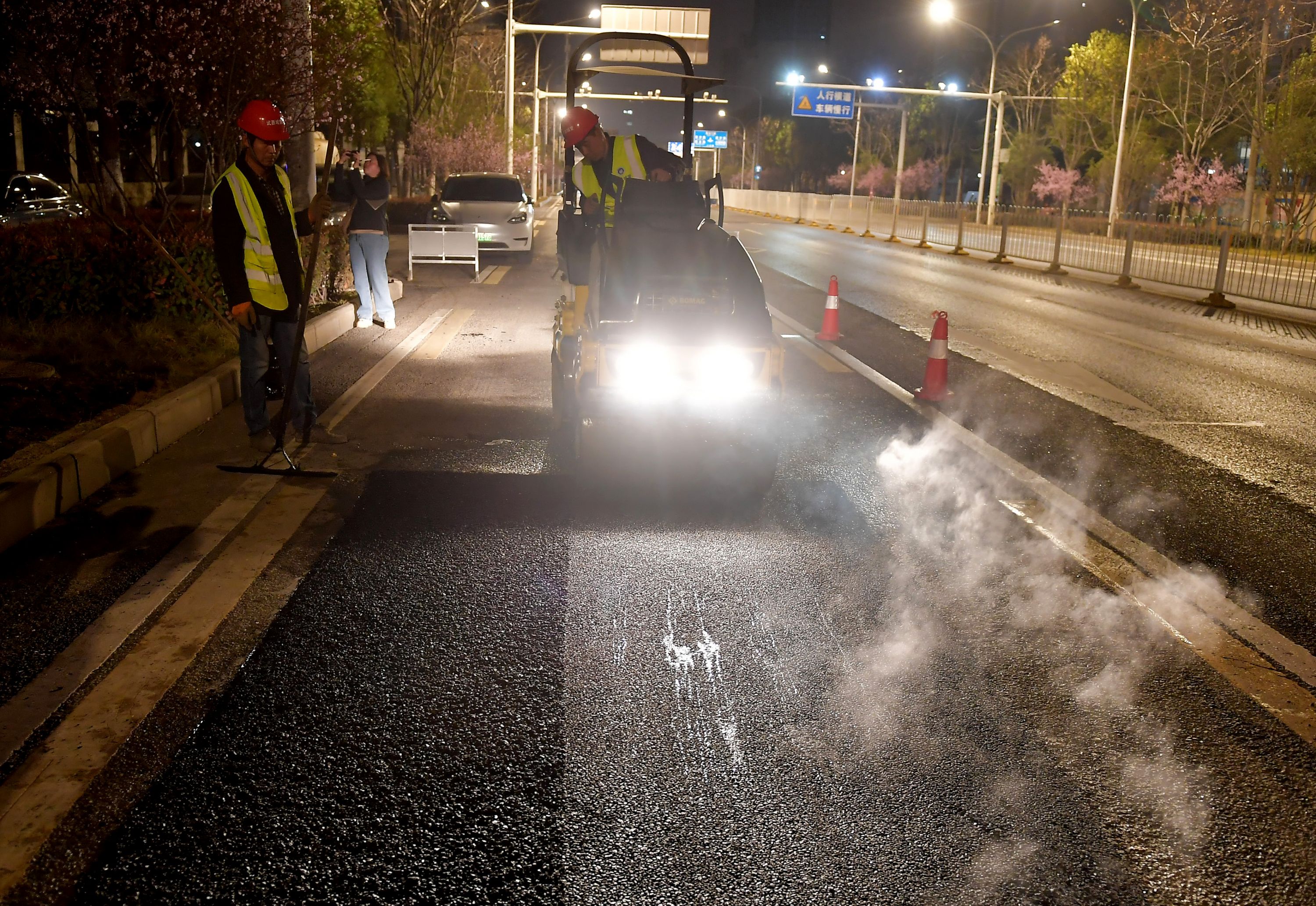 “施工前,我们将存在病害的点位标注出来,提高夜晚施工效率。”施工单位武汉城运集团项目管理部副部长周潇介绍,路面铣刨后,露出基层,扫地机配合人工清理残渣,施工人员向基层均匀喷洒粘层油,随后开始摊铺沥青,用压路机多遍碾压。
