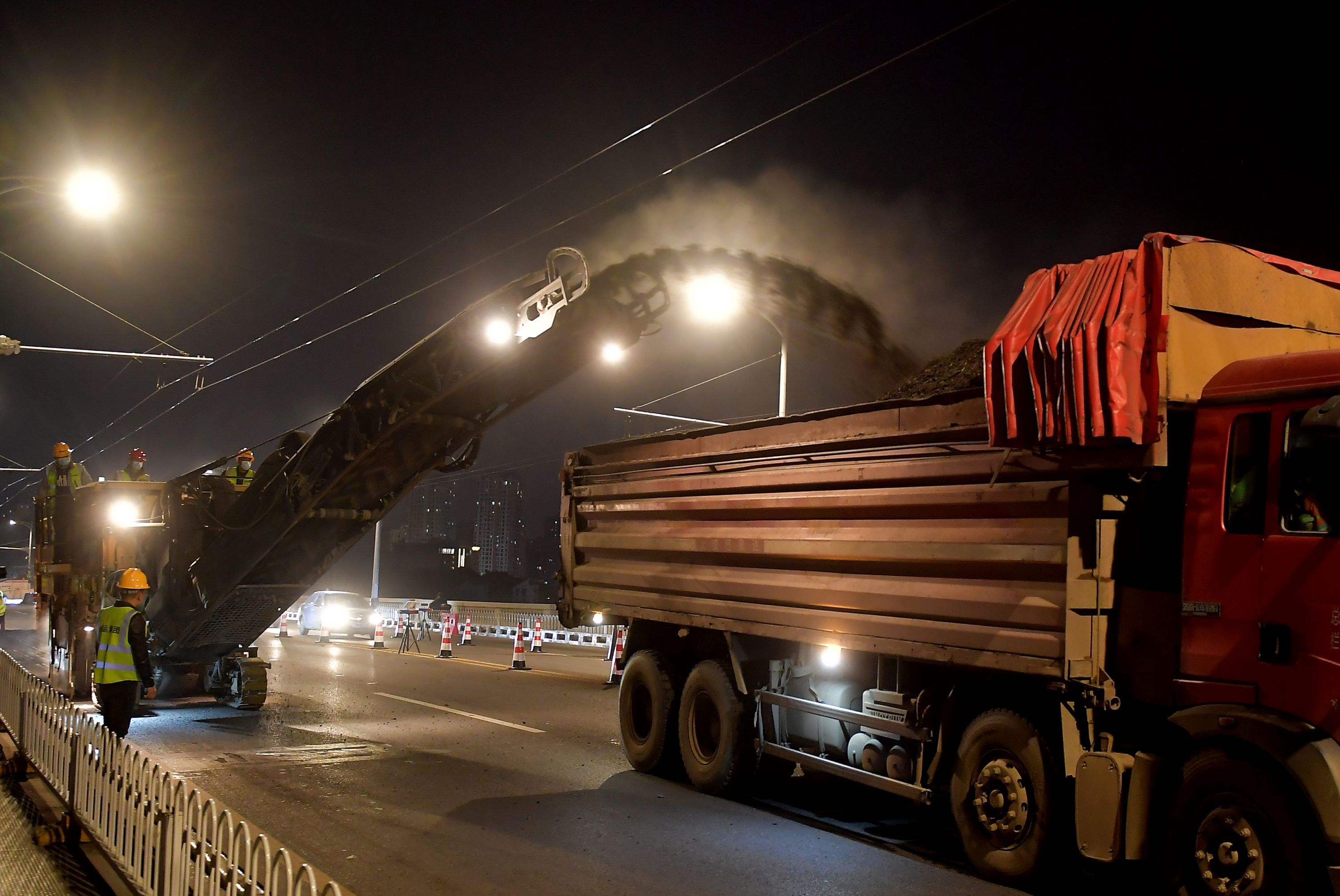 14日晚,武汉长江大桥武昌往汉阳方向打围修路,铣刨车将粉碎剥离的旧沥青渣输送至渣土车。记者刘斌 摄