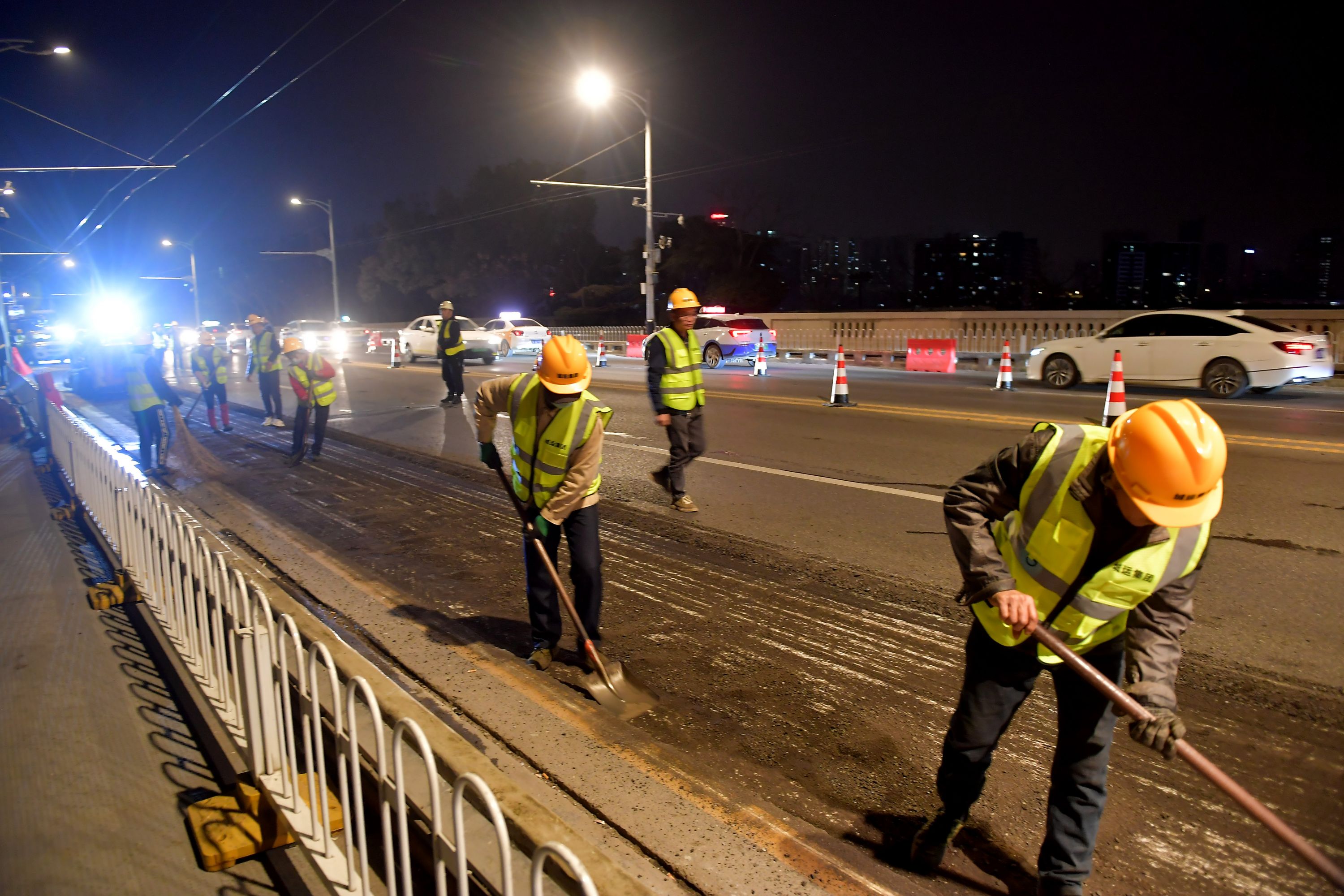14日晚,武汉长江大桥武昌往汉阳方向打围修路,施工人员清理基层残渣。记者刘斌 摄