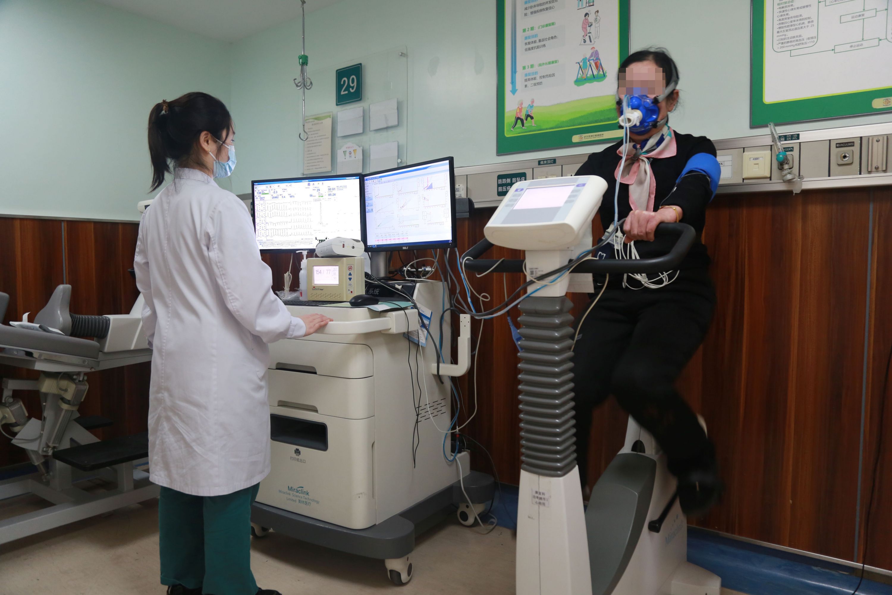 心肺运动试验则是让吴先生在踩脚踏车的过程中,逐步增加运动强度。检测设备则通过采集他吸入的空气和呼出气体进行测试,来观察高强度运动时的血压、摄氧量和心率。