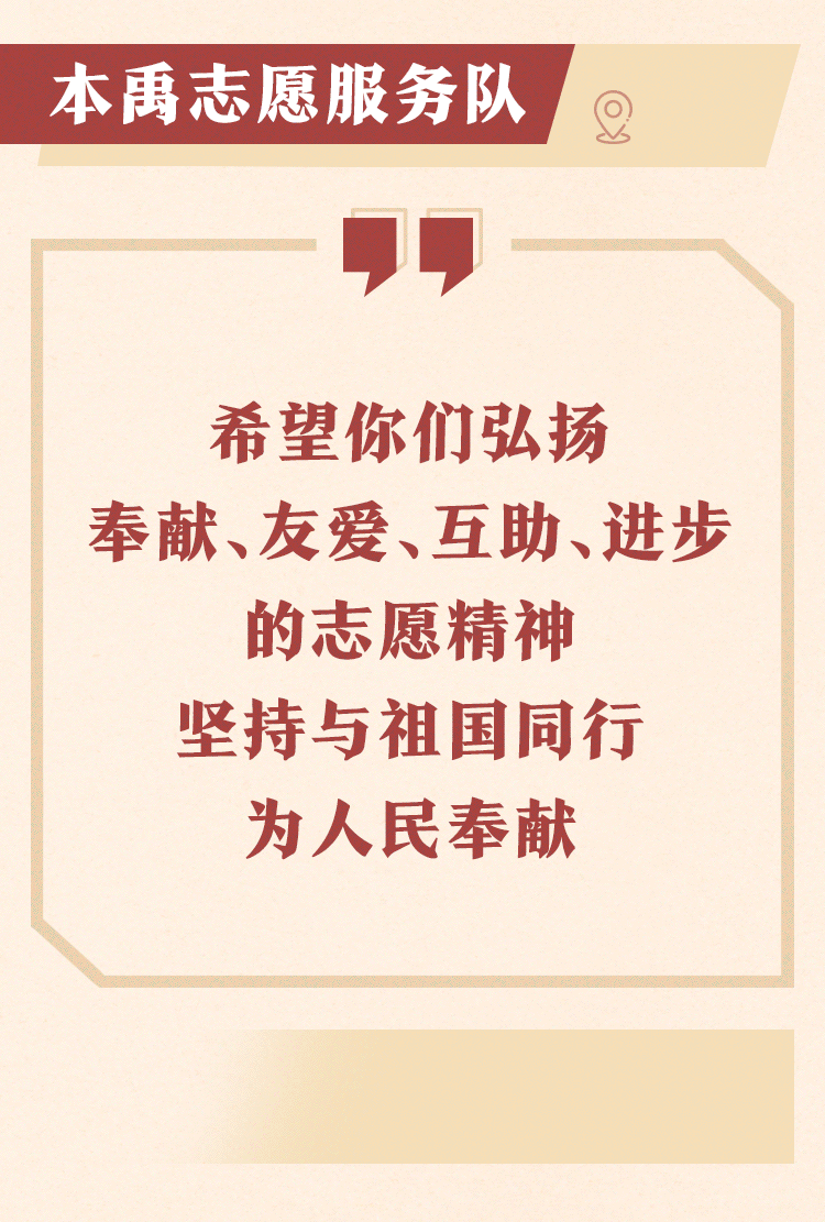 2013年,在中国青年志愿者行动实施20周年暨第二十八个国际志愿者日之际,习近平总书记给华中农业大学“本禹志愿服务队”回信,肯定他们在服务他人、奉献社会中取得的成绩和进步,勉励他们弘扬志愿精神,为实现中华民族伟大复兴的中国梦作出新的更大贡献,并向这支志愿服务队和全国广大青年志愿者致以诚挚问候和崇高敬意。