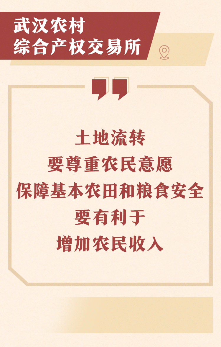 2013年7月,习近平总书记来到武汉农村综合产权交易所考察,听取了农村产权探索情况汇报,同工作人员和前来办理产权流转交易鉴证手续的农民交谈,详细询问产权交易具体流程,认为这是一个积极探索。