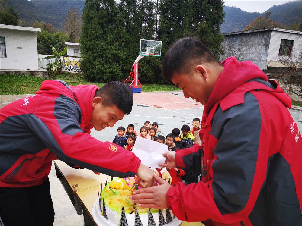 “本禹志愿服务队”队员王庆鲁(右)与队友为贵州华农大石希望小学的留守儿童集体过生日。(本人供图)