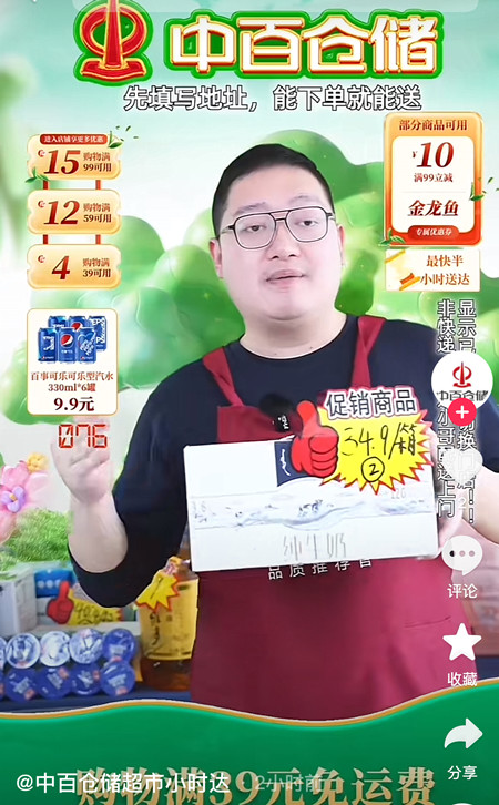 近日,中百集团仓储公司上线抖音小时达到家业务。作为湖北省内首批上线抖音小时达业务的零售企业,全省100多家仓储门店协同发力,促进即时零售需求转化,消费者直播间下单,1小时内速达“家门口”的购物体验。记者在直播间下单鲜牛奶、热干面、水果等,半小时后即送达。