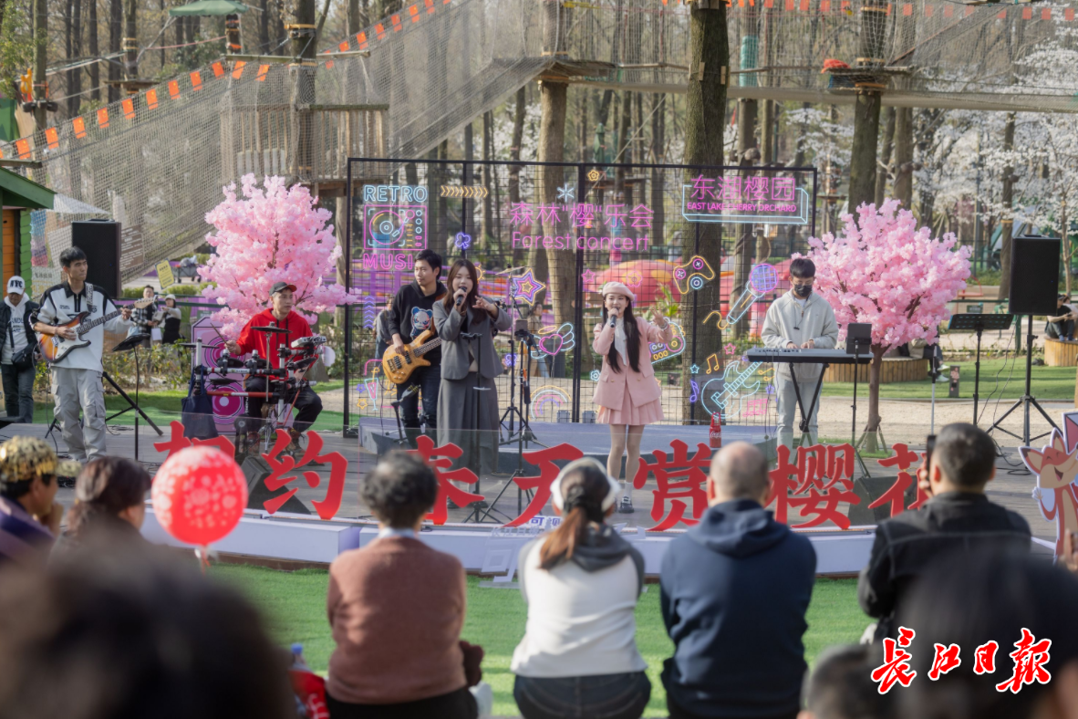 春分的东湖樱花园,满园早樱在春风中下着花瓣雨,粉白色中樱已盛放枝头,郁金香、喷雪花、二月兰、油菜花层层叠叠点缀在樱花海下。“想要光着脚丫,在树上唱歌……”“春风绕岸边柳絮飘,我手把船儿摇呀摇,绿水长青山高,那时青梅竹马正年少,万花丛中谁拈花一笑……”“蝴蝶自在飞,花也布满天,一朵一朵因你而香……”歌手们在东湖樱花园的露天舞台和樱花树下尽情歌唱,周边来自全国各地的游客或驻足聆听,或干脆席地而坐,一边赏花一边听歌,享受春日时光。