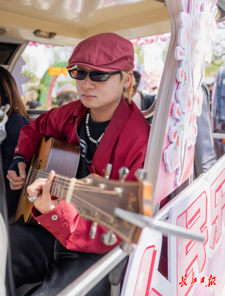 布满“樱花”的音乐直播车吸引了沿途游客的关注。 记者余倩 摄