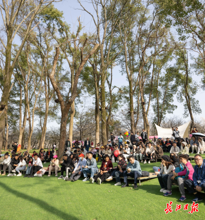 东湖樱花园中,来自全国各地的游客坐在樱花林边共享音乐。 记者余倩 摄
