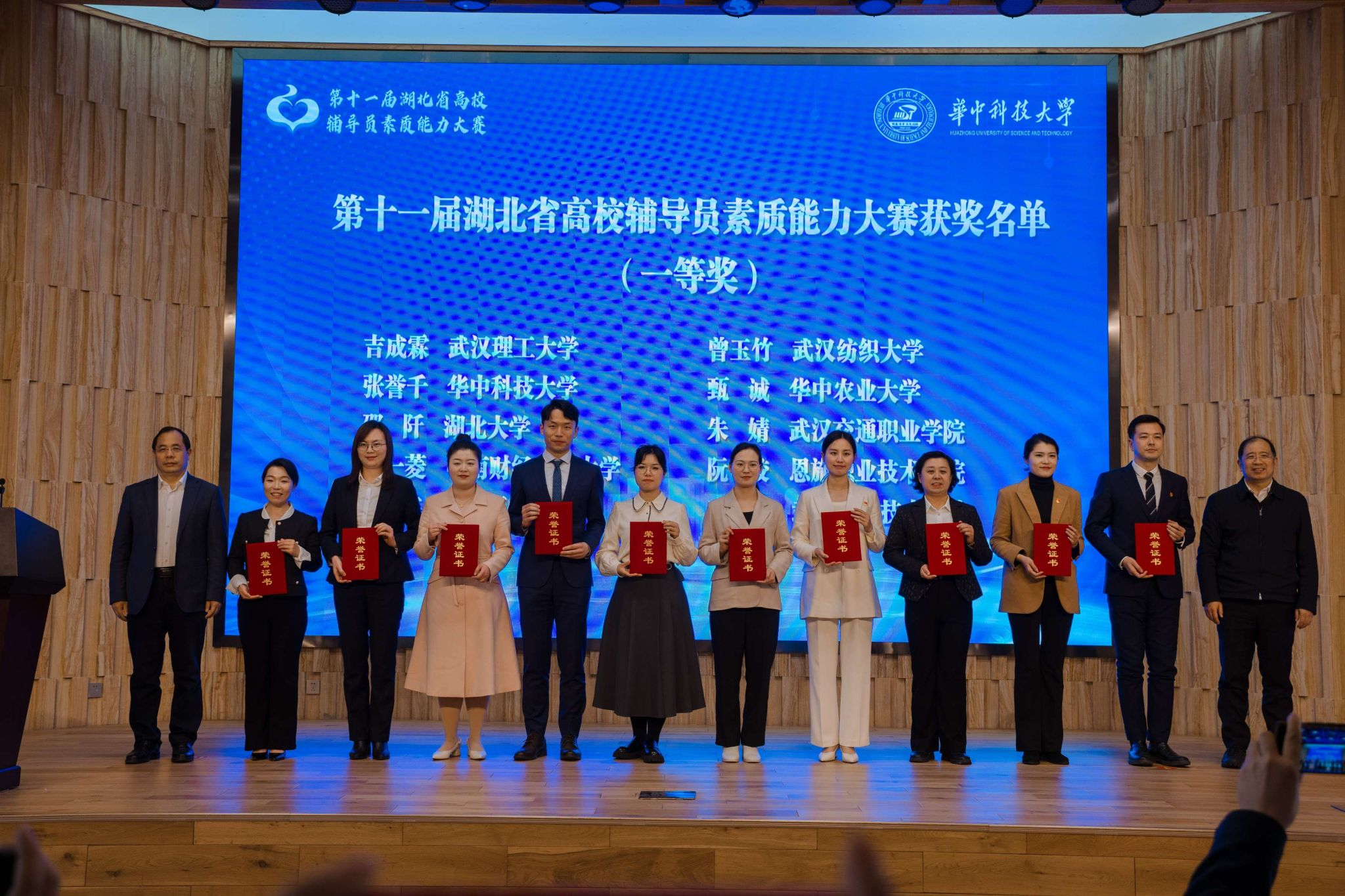 湖北省高校辅导员素质能力大赛,湖北工业大学程宇(右6)获得一等奖。