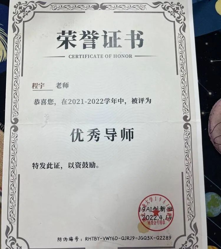 “学生的好评是对我最大的鼓励。”程宇说。2022年是她做辅导员的第三年,2019级AI创新班全班同学自发评选,给她颁发优秀导师荣誉证书,虽然并非官方背书的证书,但程宇还是很开心,“它代表着学生们对我的认可,是我人生中最具有价值的奖状。”