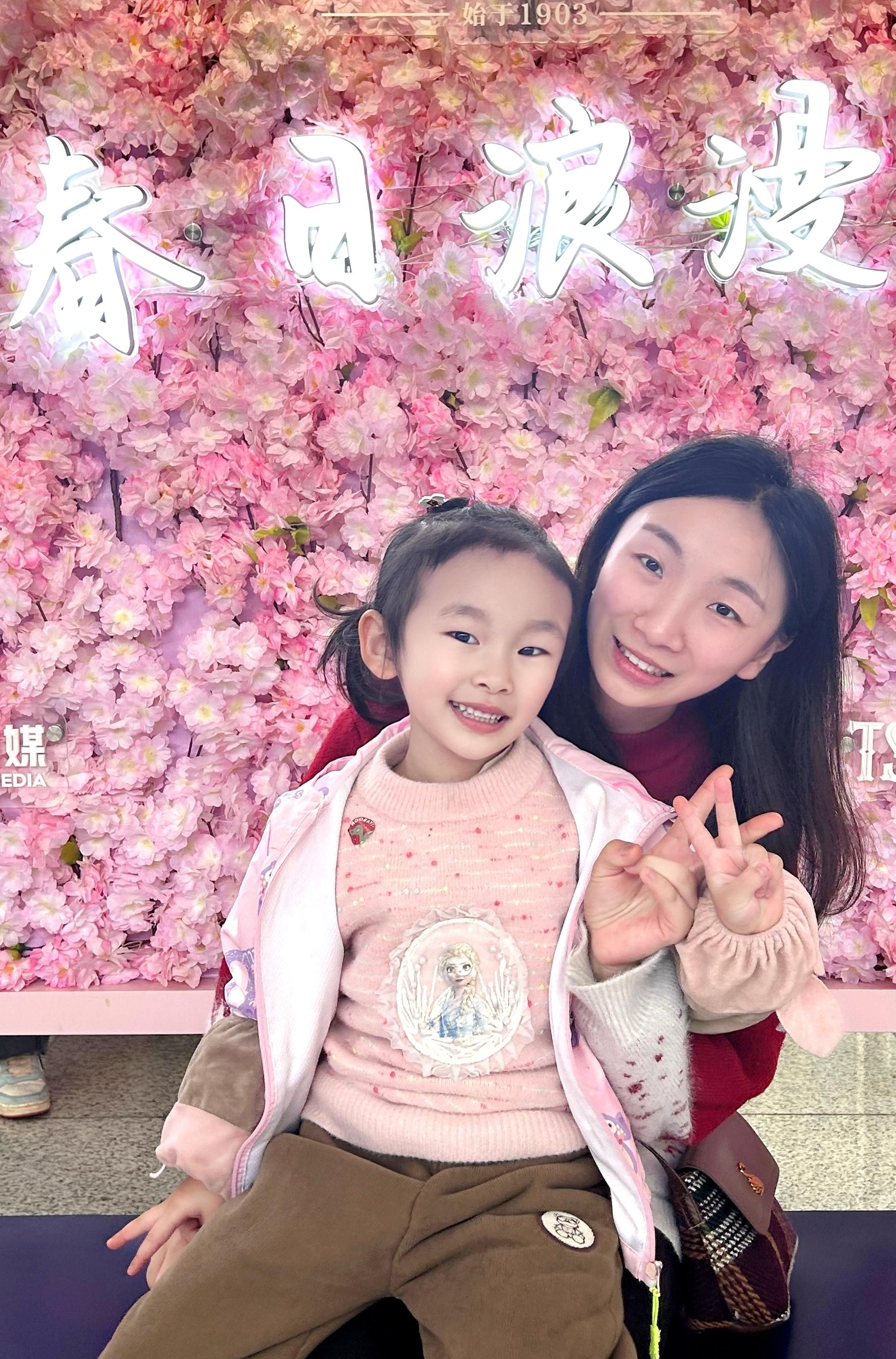 一位母亲带女儿在樱花站台背景墙前拍照。图/受访者供图