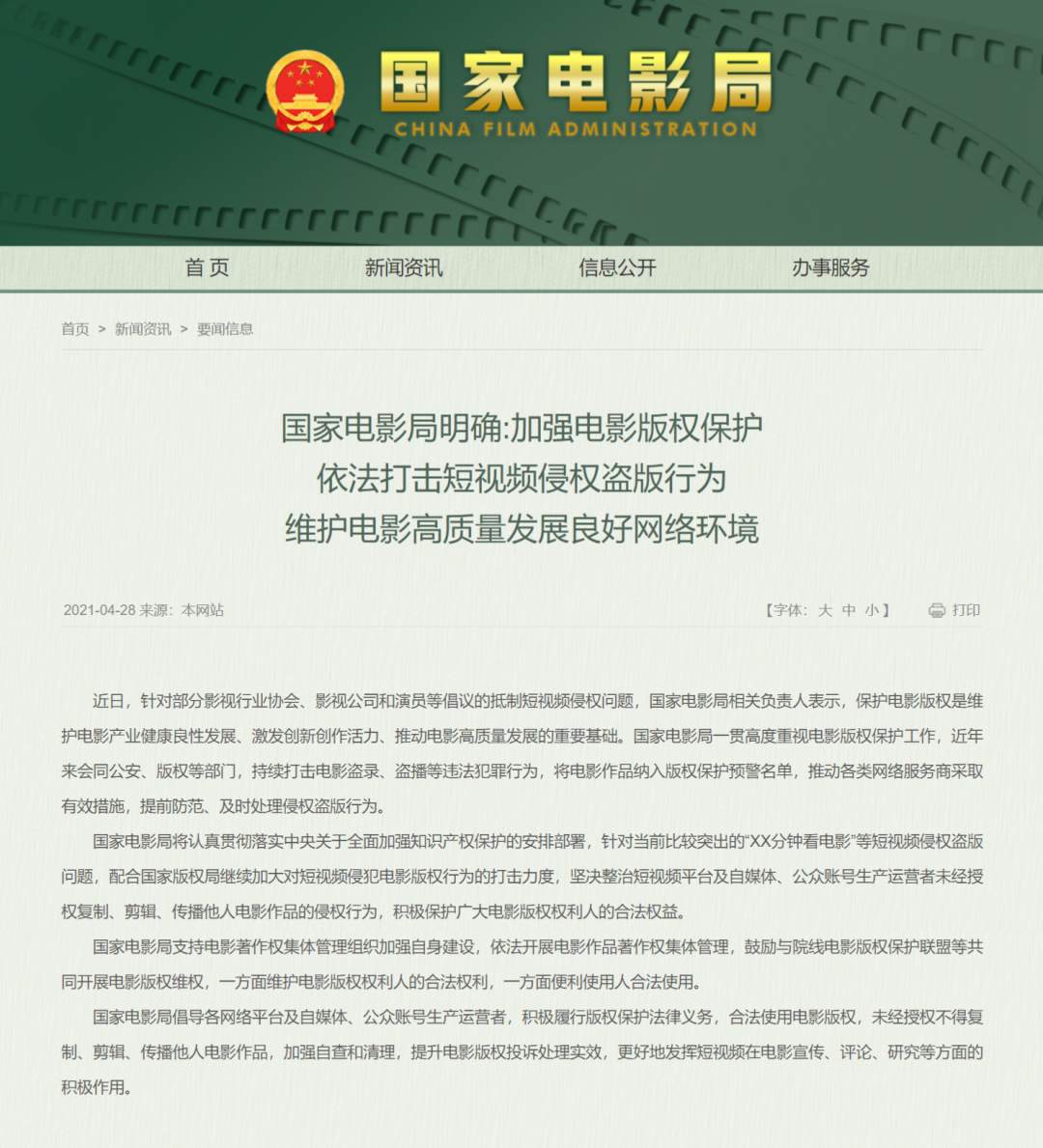 国家电影局网站4月28日消息,近日,针对部分影视行业协会、影视公司和演员等倡议的抵制短视频侵权问题,国家电影局相关负责人表示,保护电影版权是维护电影产业健康良性发展、激发创新创作活力、推动电影高质量发展的重要基础。国家电影局一贯高度重视电影版权保护工作,近年来会同公安、版权等部门,持续打击电影盗录、盗播等违法犯罪行为,将电影作品纳入版权保护预警名单,推动各类网络服务商采取有效措施,提前防范、及时处理侵权盗版行为。