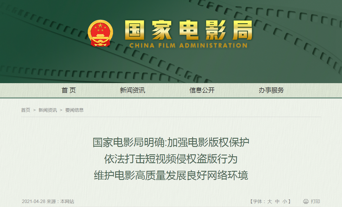 国家电影局将认真贯彻落实中央关于全面加强知识产权保护的安排部署,针对当前比较突出的“XX分钟看电影”等短视频侵权盗版问题,配合国家版权局继续加大对短视频侵犯电影版权行为的打击力度,坚决整治短视频平台及自媒体、公众账号生产运营者未经授权复制、剪辑、传播他人电影作品的侵权行为,积极保护广大电影版权权利人的合法权益。