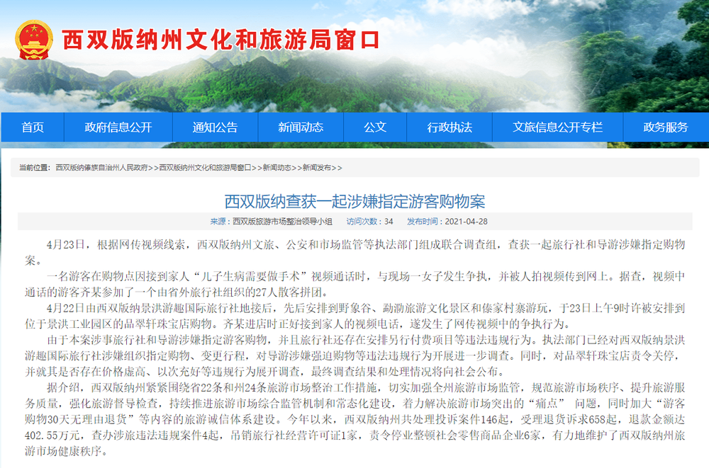 4月23日,根据网传视频线索,西双版纳州文旅、公安和市场监管等执法部门组成联合调查组,查获一起旅行社和导游涉嫌指定购物案。