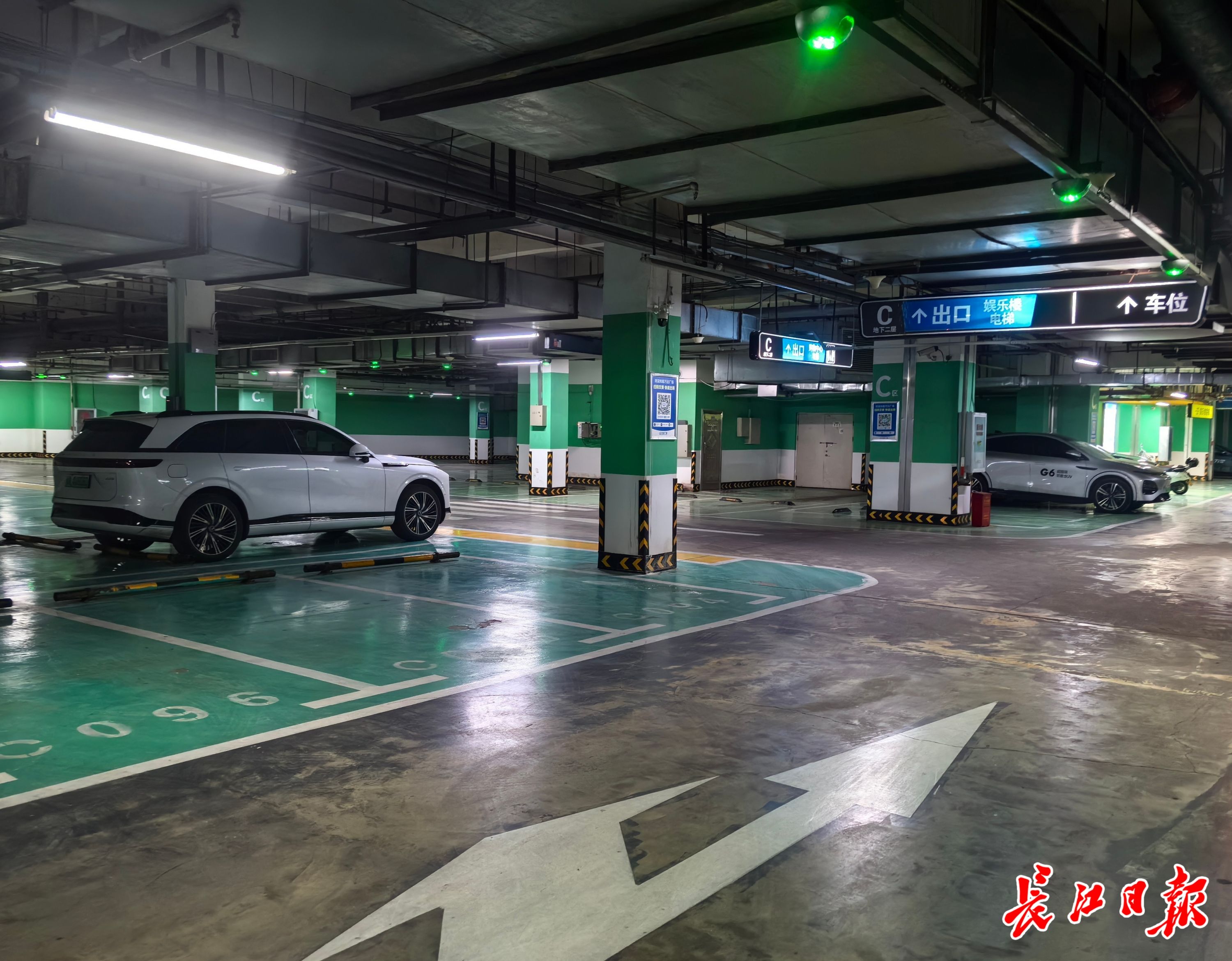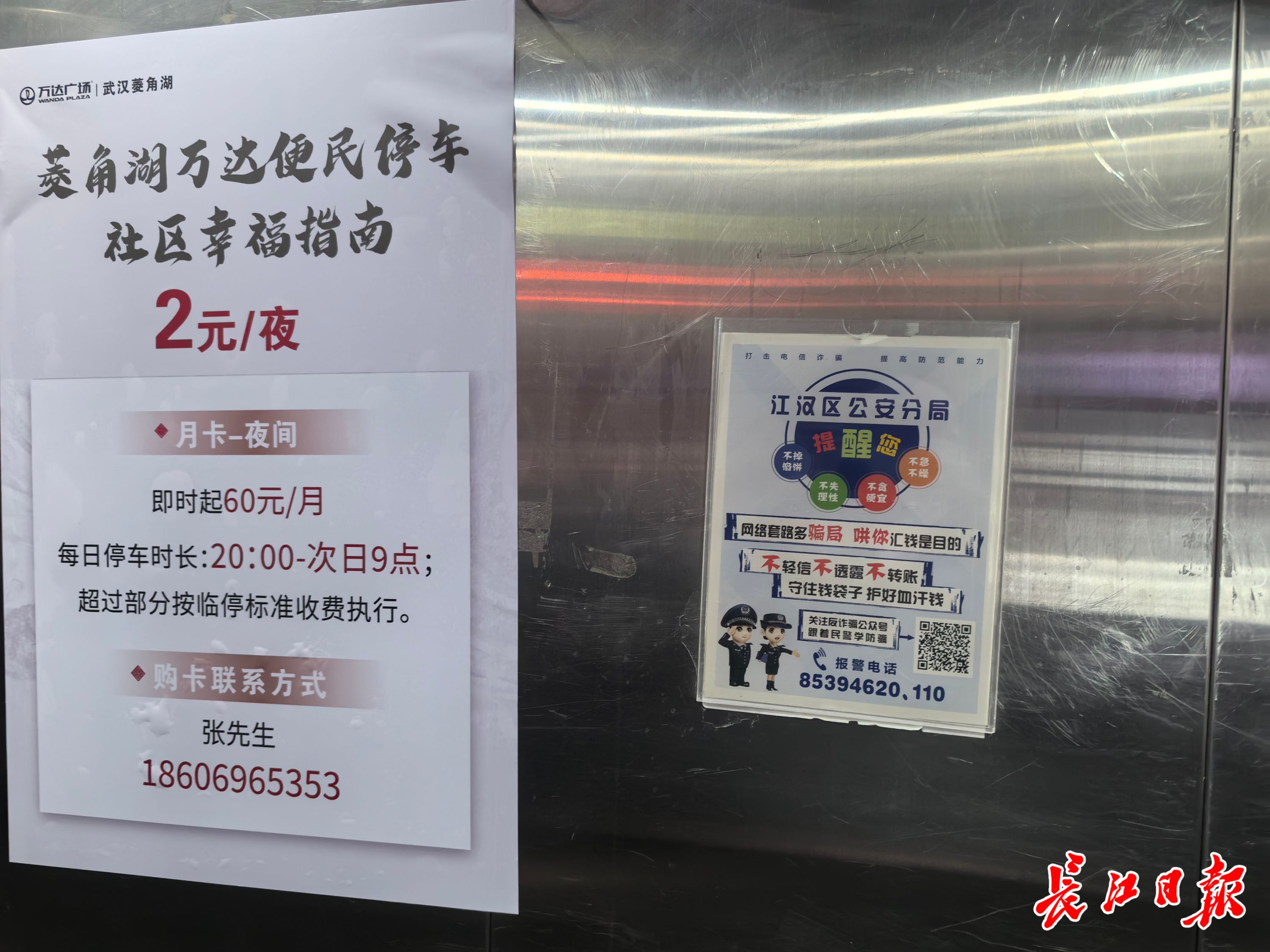 记者在菱角湖万达广场看到,其地下停车场出入口车辆进出有序,停车场内有部分机动车停放,空余车位相对充足。在其写字楼一部电梯轿厢内,记者看到一张海报上写着:“菱角湖万达便民停车社区幸福指南,2元/夜。”海报上附着夜间停车月卡时段及收费标准,以及办理联系人的电话。