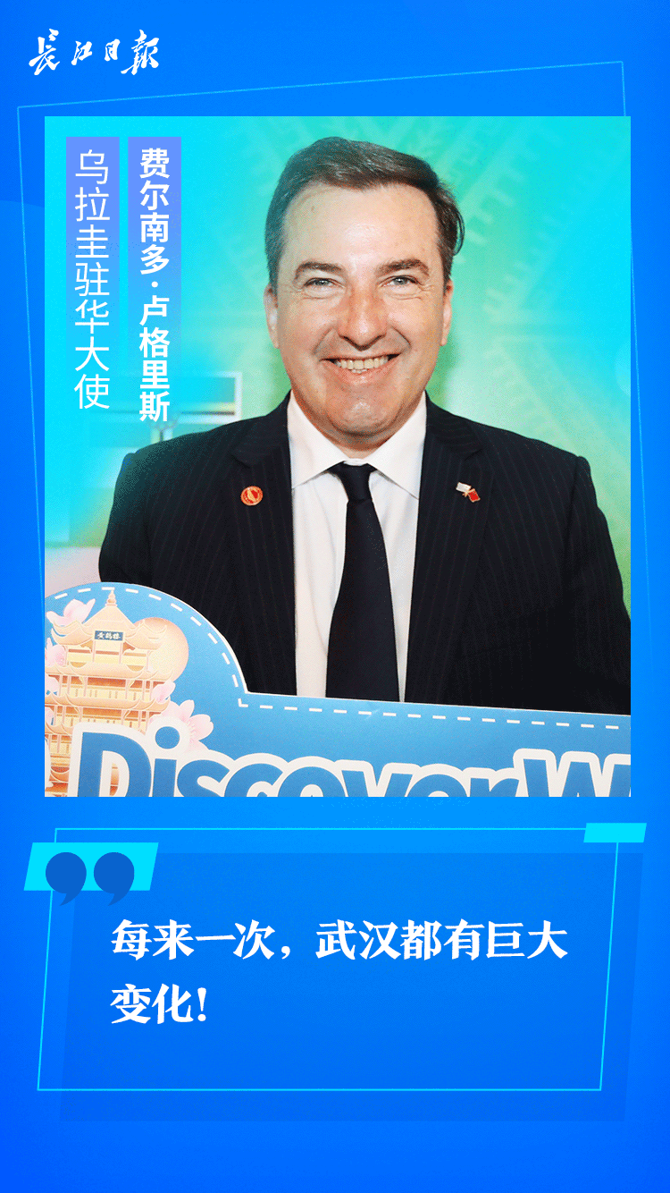卢格里斯大使对武汉很有感情,很多年前,他参加乌拉圭足球代表团曾来过武汉。2019年10月,在他的支持下,来汉出席第七届世界军人运动会的乌拉圭军体代表团集体访问了长江日报报业集团。这次,作为拉美和加勒比国家驻华使节代表团团长,卢格里斯大使第三次访问武汉。他指着落地大窗外的长江说:“每来一次,武汉都有巨大变化!这座城市历经疫情的考验后,变得越来越有生气、越来越繁荣了!”