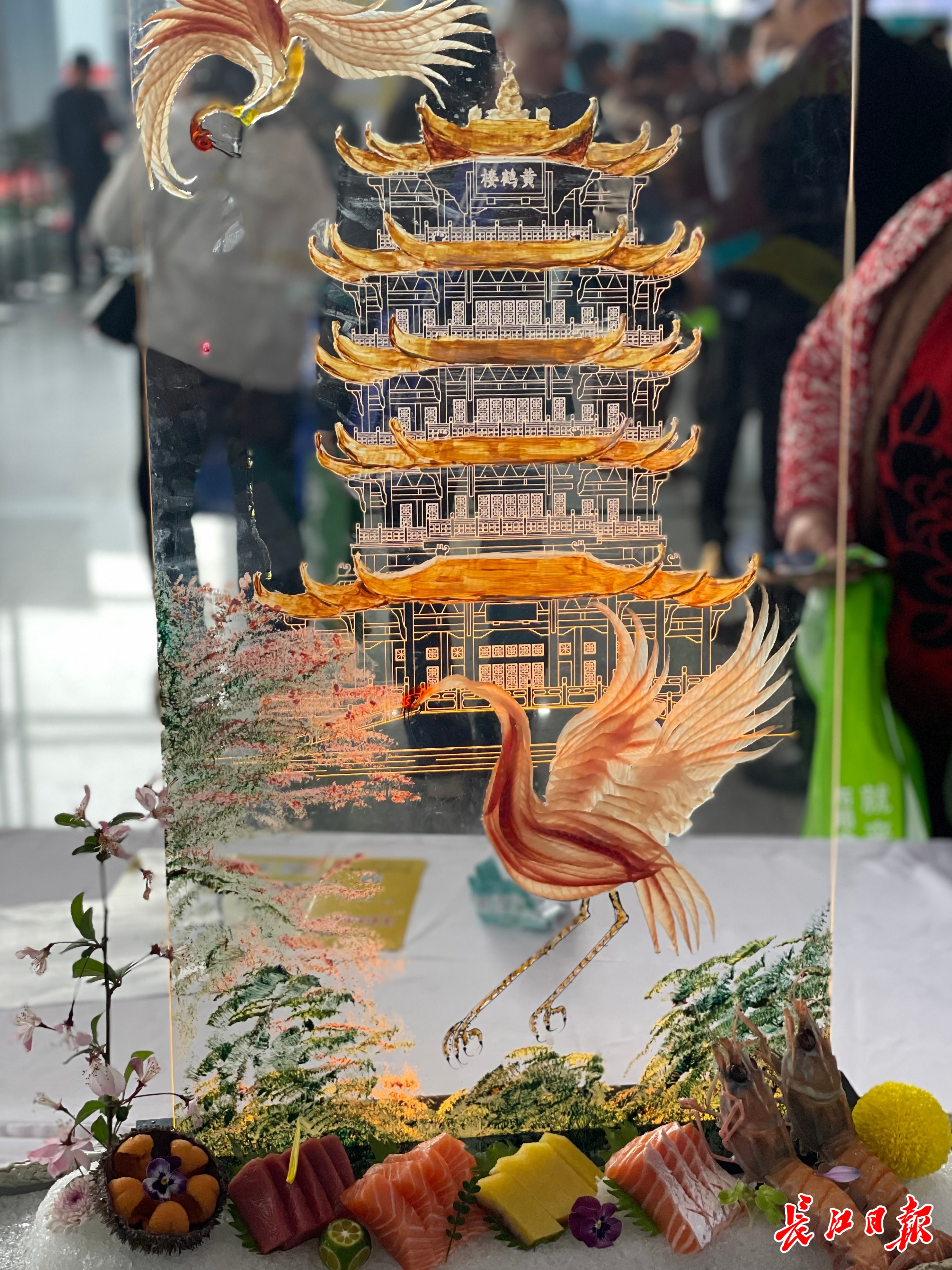 《楼上楼盛宴》是武汉99后厨师杨浩的作品,以果酱画的黄鹤楼做背景,鱼生雕刻成展翅黄鹤,食物造型里还有海胆、三文鱼等。他告诉记者,他一开始就决定要把武汉地标黄鹤楼放进创作,“构思了一个星期,黄鹤楼和黄鹤的部分花了两个小时,食材造型半个小时就完成了,刚刚看到很多人在拍,满足了。”