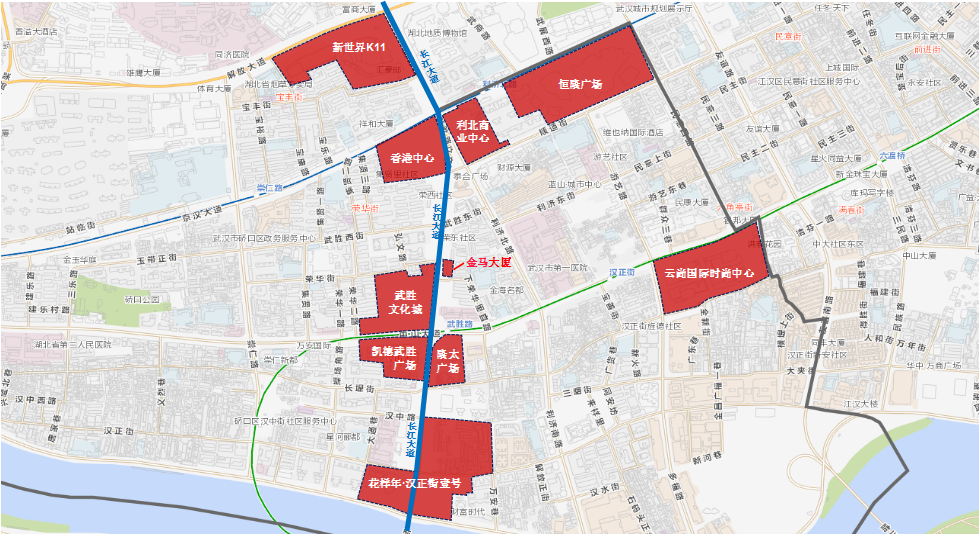 据硚口区商务局负责人介绍,“武汉城市商脉主轴”占地1.5平方公里,贯穿解放大道、京汉大道、中山大道延伸至沿河大道,已有商业面积近300万平方米,约占全市商业面积一半,当前商品年销售额达到1000亿元,涵盖了购物中心、超级市场、百货商场、品牌首店、主题商城、连锁商店、跨境电商等全业态,商脉主轴上集聚了70余家品牌首店,既有国际奢侈品大牌入驻,也汇聚了时尚潮牌,每天客流量逾30万人次,与航空路商圈和江汉路商圈形成有力竞争。