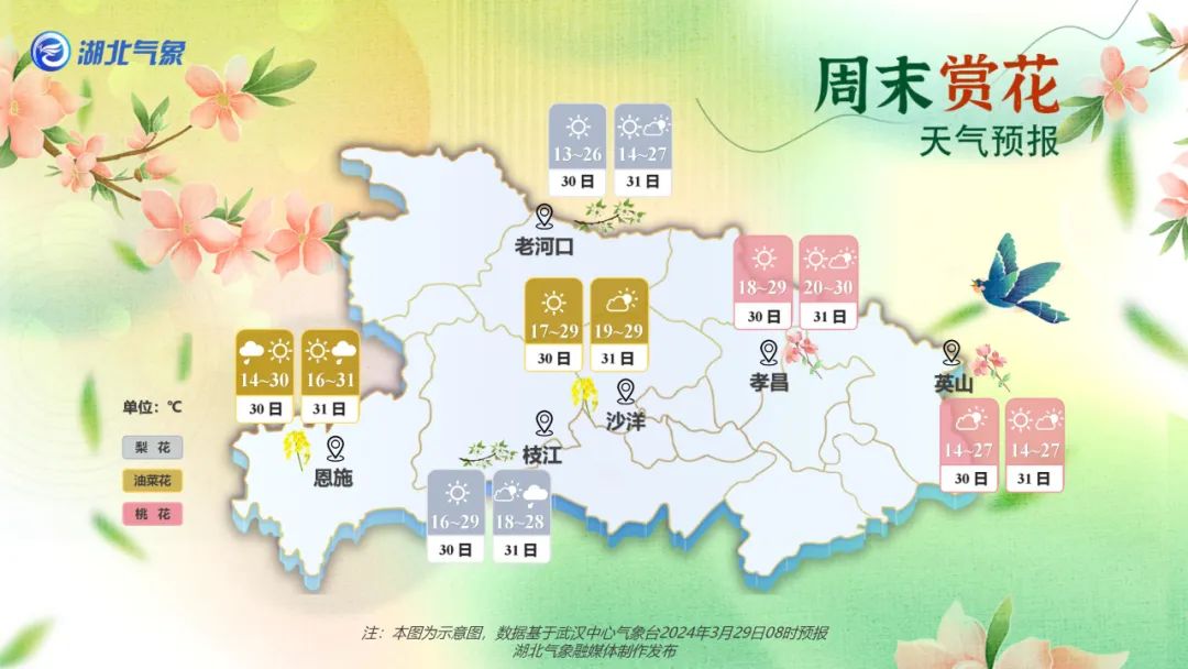 温馨提示:这周末湖北北部阳光满格,外出游玩的小伙伴注意补水防晒。南部的小伙伴记得带伞,谨防阵雨突袭。