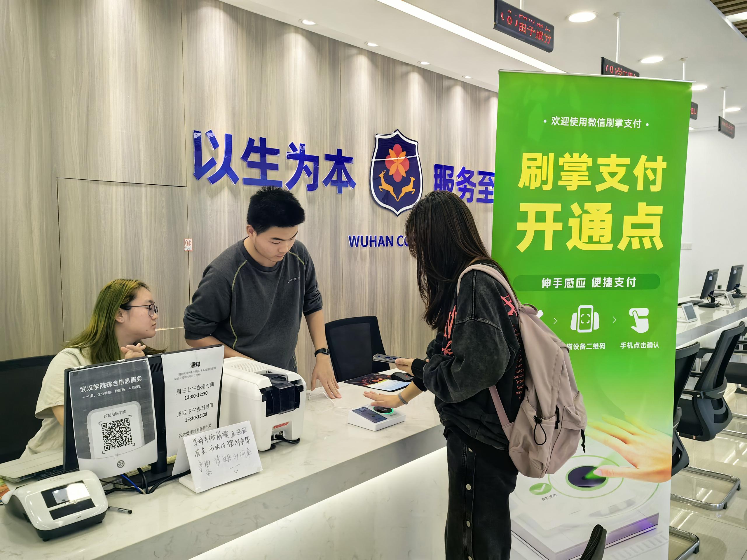 在武汉学院学生事务大厅,记者看到,很多学生在排队录入掌纹。在楚园餐厅档口,已经有学生在使用掌纹支付。只需将掌心对准刷掌机上的绿色圆环,1—2秒内就能完成支付。除了方便,掌纹支付也更加快捷,大大缩短就餐高峰期的排队时间。