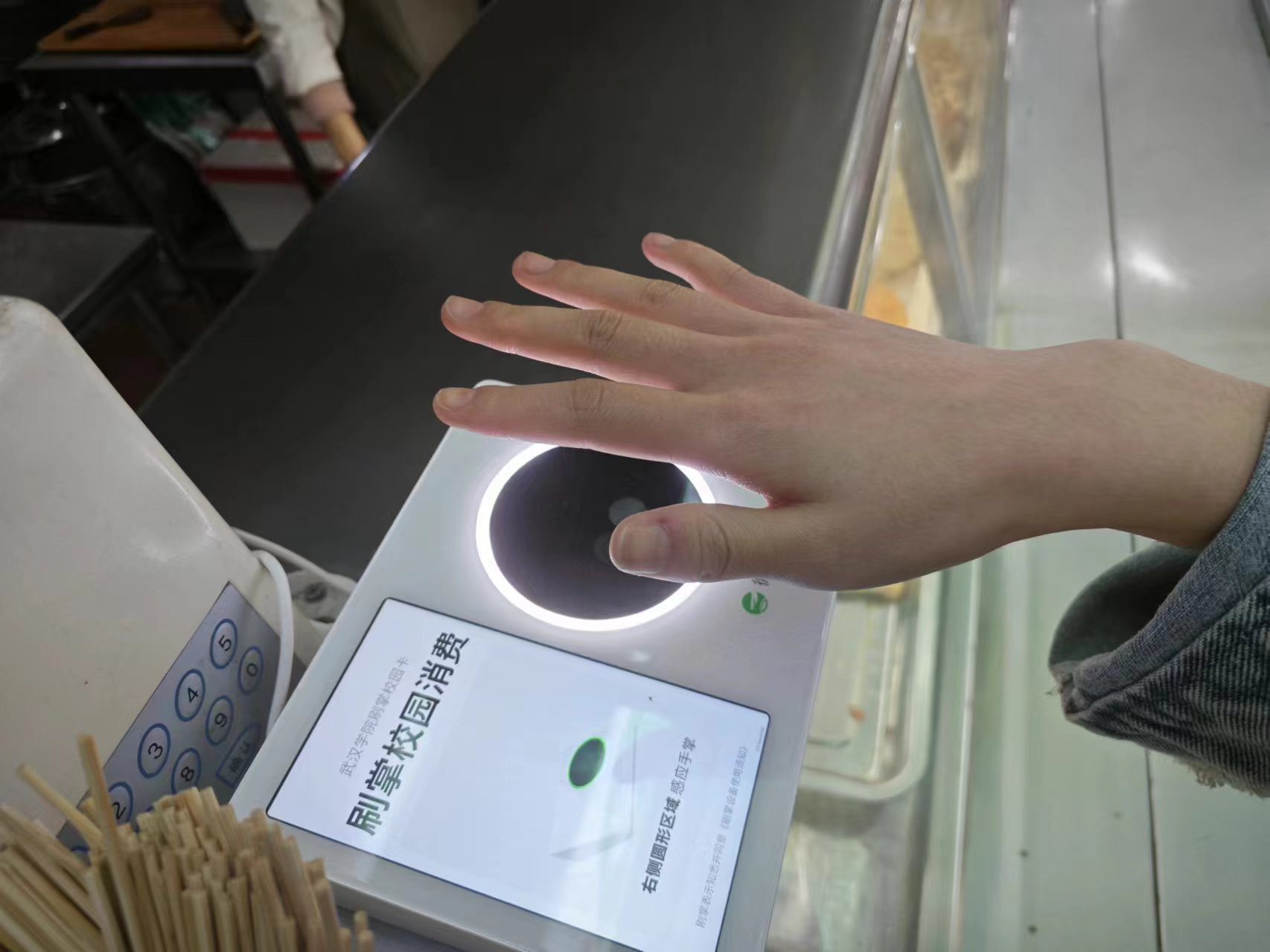 掌纹支付利用手掌纹路的唯一性和稳定性来进行身份识别和支付验证,是一种基于生物识别技术的支付方式,通过采集用户手掌的掌纹图像,对图像进行处理和比对,从而识别用户身份,完成支付交易。比起校园卡和扫码等支付方式,掌纹支付更方便,不用担心忘带手机或者手机没电等情况。“反正出门总是要带手的。”有学生调侃道。