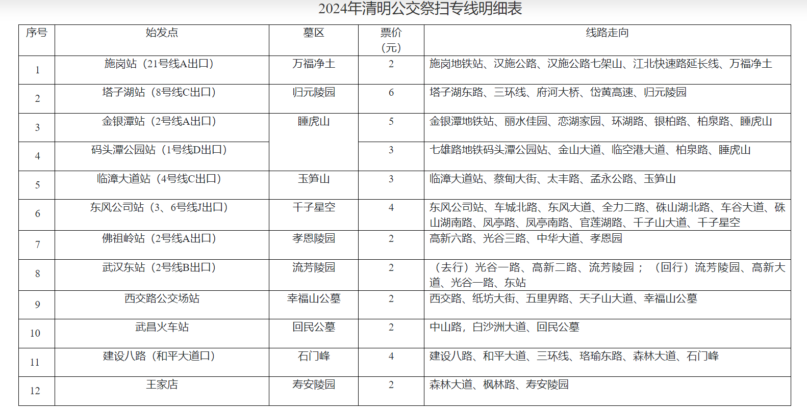 今年清明期间,为应对祭扫高峰,武汉公交集团开通了12条公交祭扫专线,在塔子湖、佛祖岭等8处地铁站,以及武昌火车站、建设八路等祭扫客流出行较为集中的点位设置了12处乘车点,直达归元陵园、孝恩陵园、流芳陵园、幸福山公墓、石门峰等11个墓区。3月30日,公交祭扫专线开通运营首日,长江日报记者对其中一些乘车点进行了实地探访。