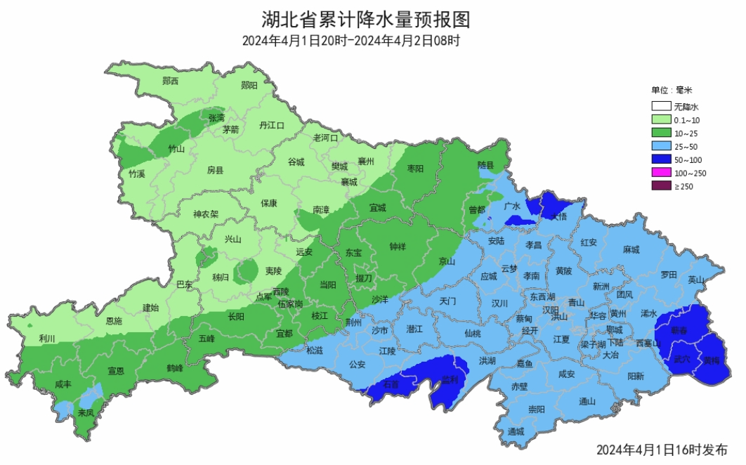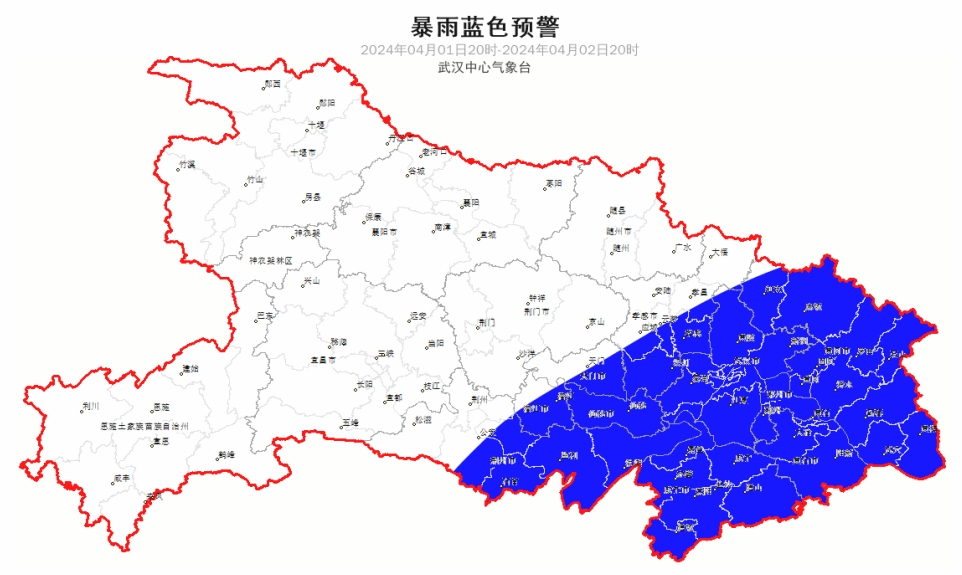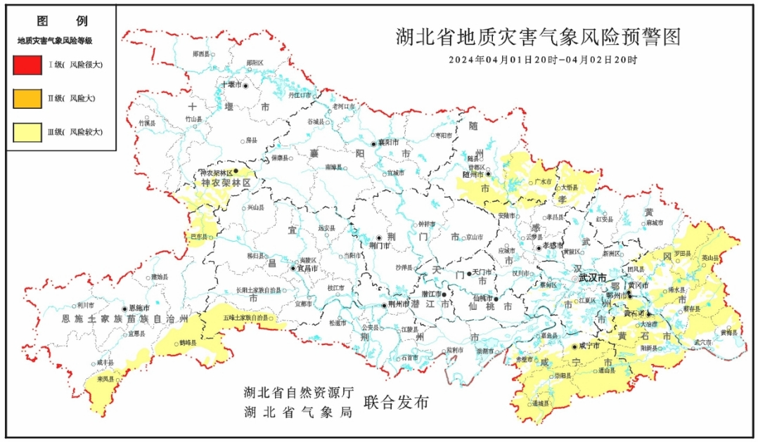 2024 年 4 月 1 日 20 时—4 月 2 日 20 时,预计三峡库区(巴东北部),神农架林区、随州地区、鄂州市、黄石地区、咸宁地区,宜昌(五峰)、恩施(来凤、宣恩东南部、鹤峰)、孝感(安陆北部、大悟)、武汉(新洲东北部、蔡甸中西部、江夏中部和南部)、黄冈(黄州区、团风、罗田、英山、浠水、蕲春、武穴、黄梅)以及其他强降水区域发生崩塌、滑坡、泥石流的风险较大,提醒公众做好防范!