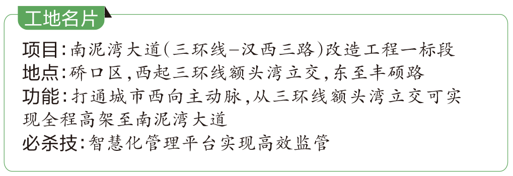 除了硬件到位,项目部的软件设施也充满“智慧”。武汉生态投资集团下属武汉市市政工程机械化施工有限公司总工程师柯文汇介绍,整个项目的运行情况,都可以通过市政集团自主研发的一套智慧化管理平台来实现监测。在项目部会议室有一块大屏,项目上有多少人员和车辆进出、扬尘噪声环境如何、工程施工是否出现了危险情况、消防是否正常,支架沉降、受力、倾斜等情况都可以在线查看,实现高效管理。
