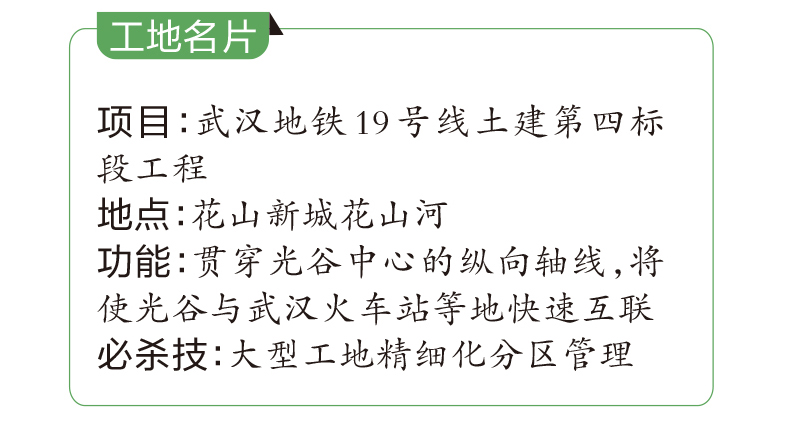 作为武汉地铁19号线全线范围最大的工地,没有想象之中工地越大越混乱的场面,科学的分区管理、分道行驶方式,让工地现场井井有条,管理有序。武汉生态投资集团下属市政建设集团负责施工的19号线土建工程第四标段,荣获2020年“武汉市文明施工标杆工地”评选的优秀工地称号。