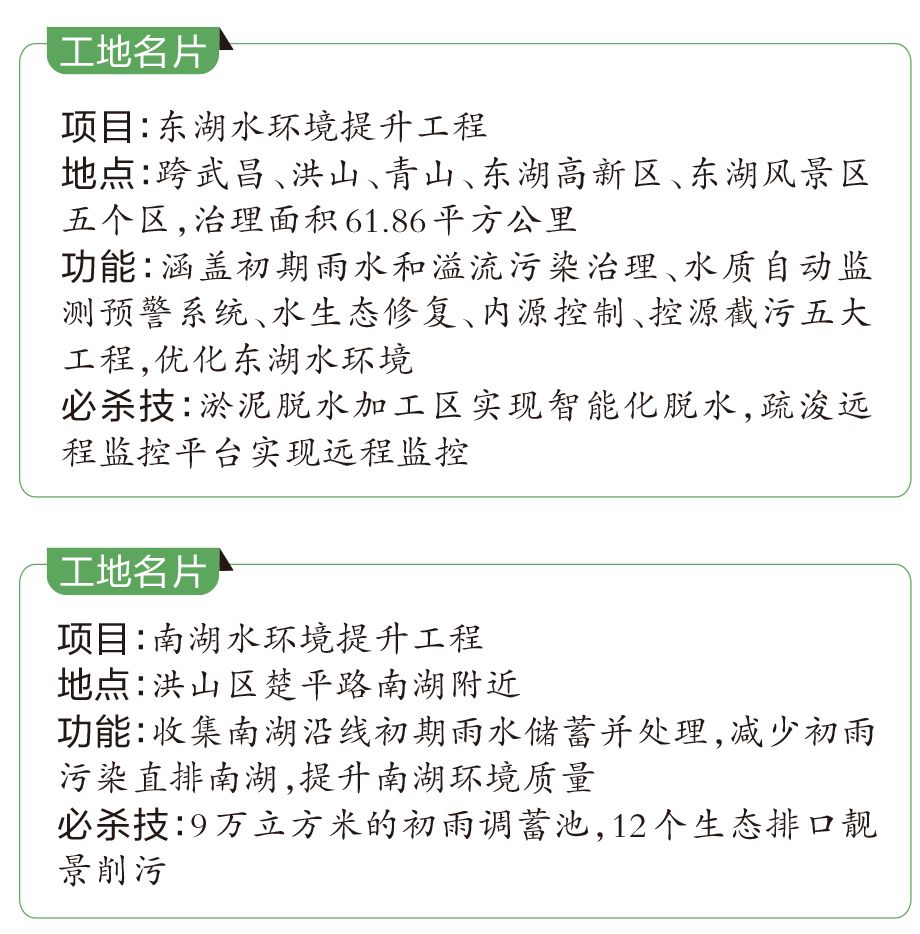 世界级的东湖,覆盖百万居民生活区的南湖,武汉两座重要的城中湖环境提升工程,是武汉生态投资集团负责实施的重点生态环境项目。其中,南湖水环境提升工程获2020年“武汉市文明施工标杆工地”评选的标杆工地称号,东湖水环境提升工程获先进工地称号。