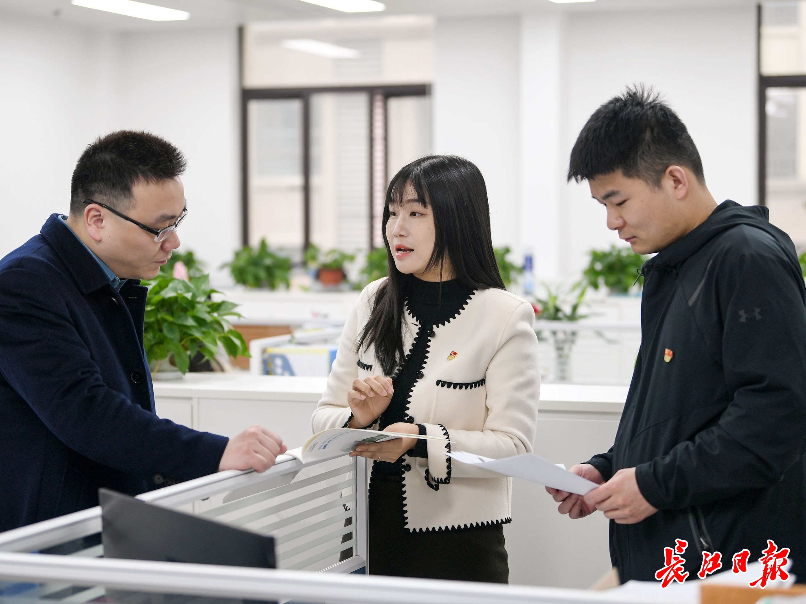 3月18日上午,李莉(中)在武汉经开区智能网联和电动汽车产业园和同事讨论工作。记者史伟 摄