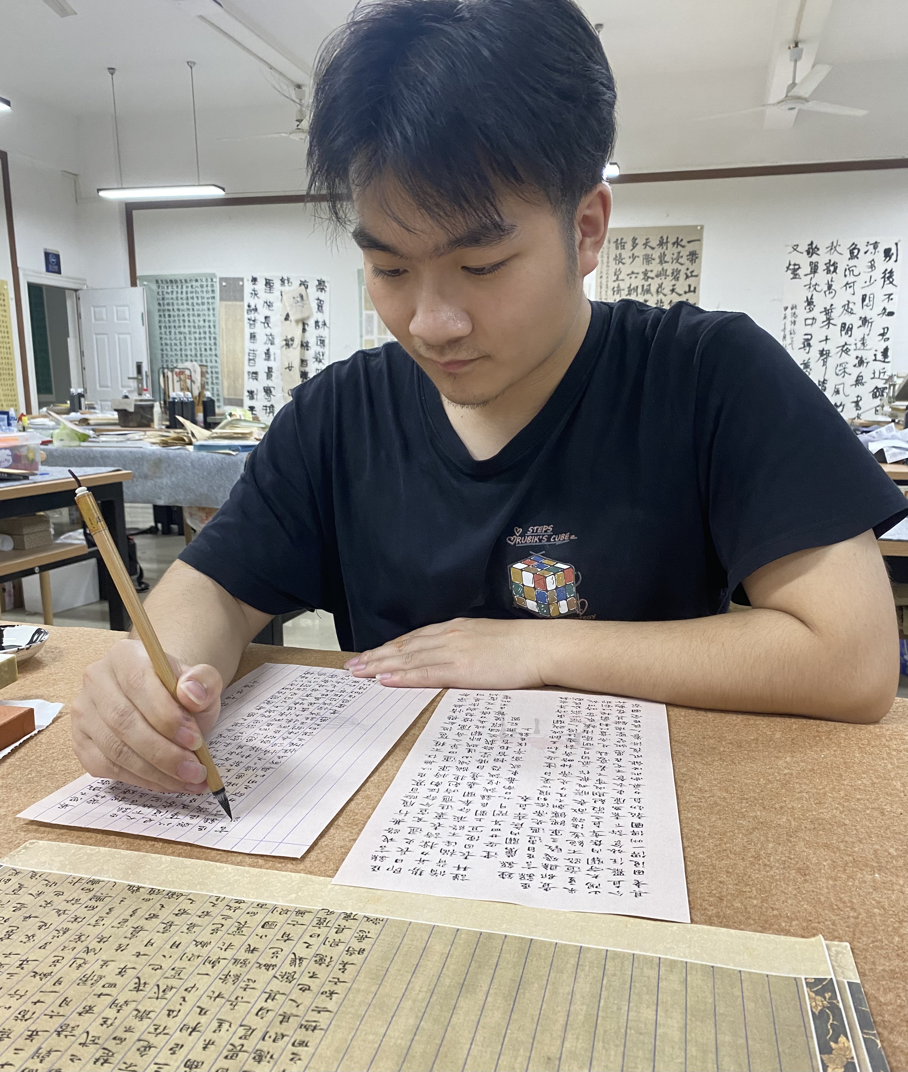 刘艺说,他从高中开始第一次接触书法就被这门艺术深深地吸引,尤其是文字背后独特的情感内涵和价值坐标。“来到大学后,和志同道合的同学们一起研习书法,在老师的循循善诱和谆谆教诲下,使我确立了人生目标——立志成为一名书法教育者。”